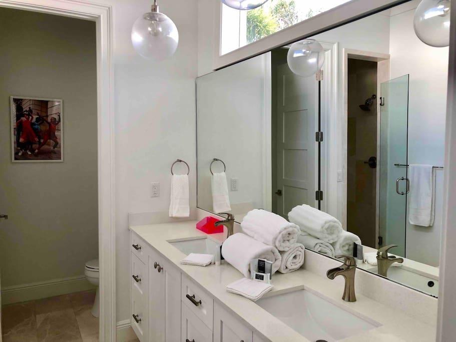 The master suite bedroom is spacious with the finest linens for the king size bed, bathroom and large walk-in closet.