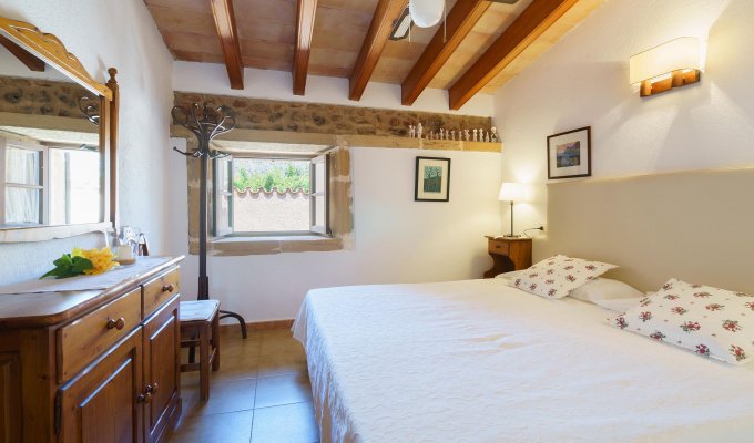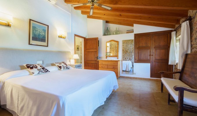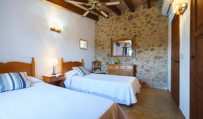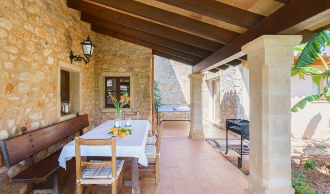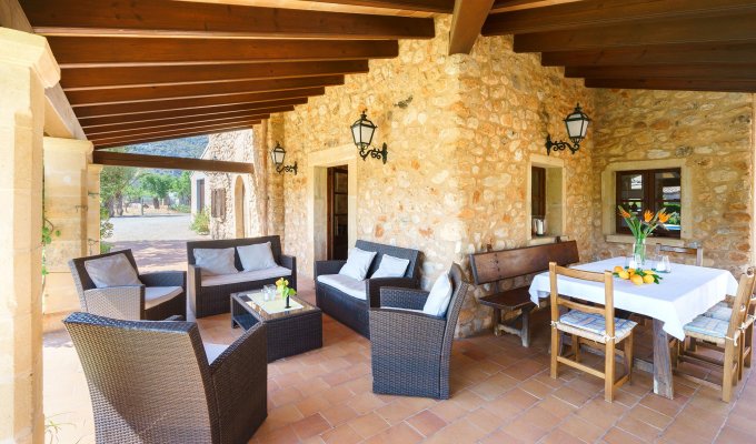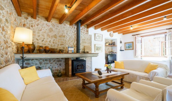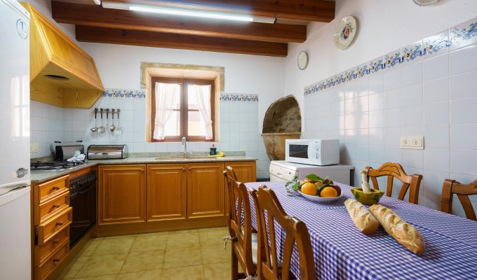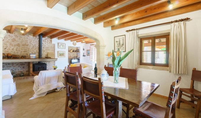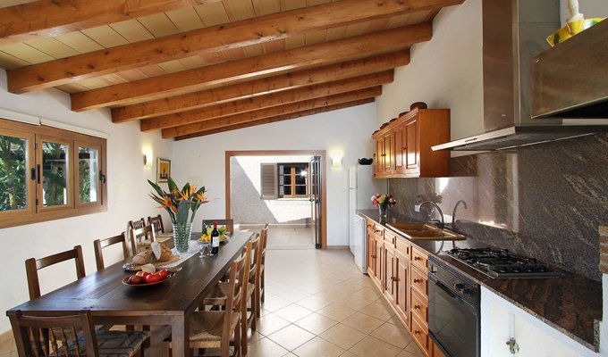 The entrance of the villa leads to the kitchen and to a very large sitting-dining room with rustic stones that create a charming mallorcan ambience.