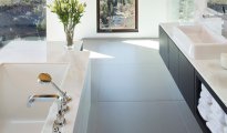 The master bathroom within the walled-in-glass bedroom features a double vanity and jetted hot tube above the bed with down valley views.