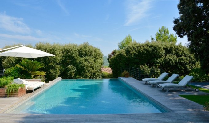 This property sits on a slight hilly stand of around 3,000 m2 planted with typical Mediterranean species like oak corns and pine trees, providing some refreshing shade during the sunny summer months. The garden and outdoor space has been cleverly shaped around the infinity swimming pool with an open view which is surrounded by a pleasant decked terrace on one side and, on the other, lawns, lavender, palm and mature oak cork trees. The villa allows its guests to enjoy total quietness, and therefore appears very well suited for families in search of a relaxing and peaceful setting. The garden is equipped with a boules ground, a trampoline, a table tennis, and a very large kids playground, to make the young ones happy, but also offers plenty of garden furniture such as an extra large sun day bed, a few lounge chairs, some armchairs and sofas, and finaly a dining table with chairs, all of which offer a high level of comfort.