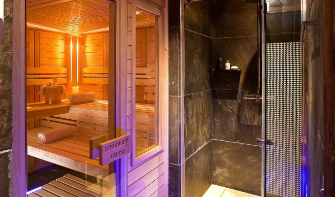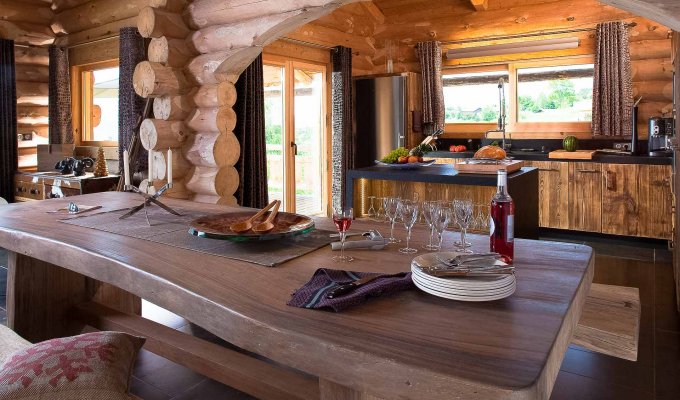 The chalet of 270 m² built according to traditional methods in massive logs, old wood and cut stone, is a cocoon of softness: large open kitchen opening onto a living room of 80 m² with a monumental fireplace offering a sumptuous panorama on the Cambre d'Aze, 5 bedrooms, Finnish traditional sauna, spacious outdoor SPA for moments of absolute relaxation, terraces, large garage with storage for skis and snowboards.