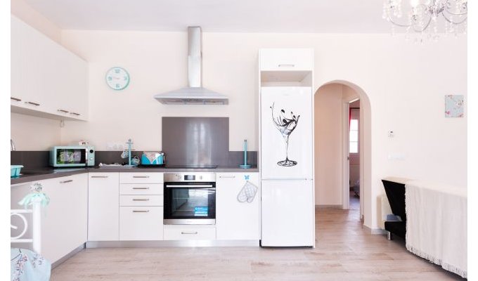 In the vitroceramic open plan kitchen, refrigerator, microwave, oven, freezer, washing machine, dishes / cutlery, kitchen utensils, coffee machine, toaster and kettle are provided.