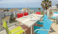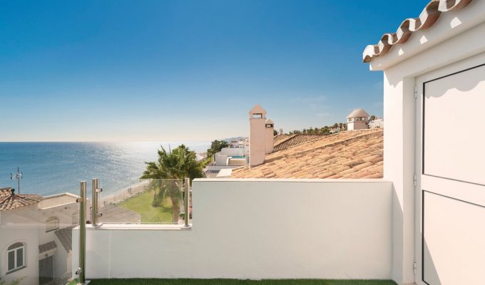This unique Mijas Costa villa rental is located right on the beach. The Costa del Sol villa rental Malaga, Malaga villa rental, with private pool is arranged over three floors and a fabulous roof terrace. The six bedrooms are bright and furnished in a contemporary style and 5 of which has en-suite 'wet room' with shower. From the lounge there are interior spiral stairs to access the roof terrace. Here you will find lawned floor (Imitation) with sun loungers, a shower and to add that final touch, a plunge pool of 3 m² for your enjoyment. The view from here is fantastic and you can sit and enjoy a cocktail and watch the sun go down over the sea that is just 35m away.