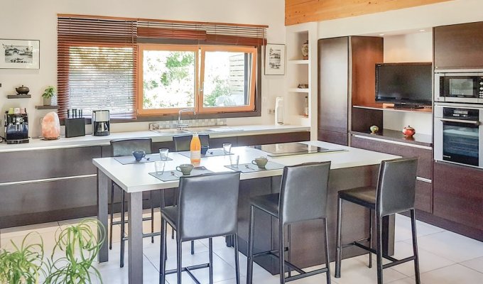 This beautiful holiday home will seduce you at first sight! Located in Moëlan-sur-Mer, 5.7km from the beaches and 13km from Quimperlé, this wooden house with contemporary architecture offers a bright and comfortable interior and will be ideal for holidays with family or friends in Finistère. To enjoy the sun, a beautiful wooden terrace of 48m² awaits you and you will love the large garden of 1300m². Bedroom # 1 is very large and has a private bathroom. 1500m away, one of the most beautiful ports of Brittany awaits you. 5.7 km away, the beach of Kérou welcomes you for beautiful sunny days and water sports enthusiasts will find their happiness. In the surroundings you will make discoveries and exciting visits, starting with Quimperlé and its abbey of Sainte Croix (13 km). Pont-Aven and its historic center will charm you just as much 16 km), as Quimper and its beautiful streets lined with half-timbered houses (52 km). Want to remain fit or just relax? Golf, horse riding or leisurely bike rides, you will find your happiness! In Pont-Scorff, the Zoo and the aquarium (23km) will delight young and old and you will spend a beautiful day at the Labyrinth of Pont-Aven. And for gourmands, creperies will be an essential step. Come and discover Finistère thanks to this beautiful vacation rental.