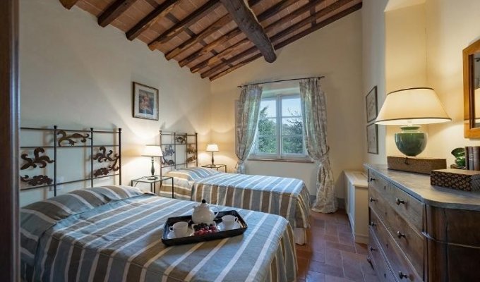 It is a building with original stone walls, decorated with red bricks characteristic of rural buildings in Tuscany, in the heart of a private garden with English lawns and large vases of flowers, lemon trees, aromatic plants and a pergola covered with different kinds of climbing plants.