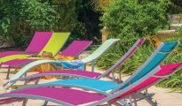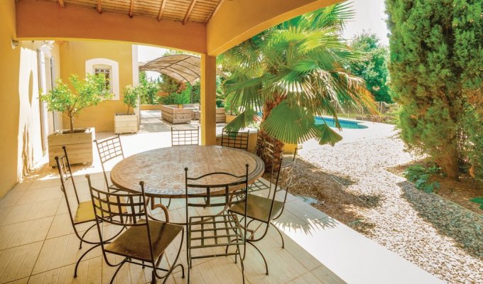 n Thézan-les-Béziers in the Hérault, just 26 km from the beaches of Sérignan and Valras, you will find this beautiful holiday home with a heated pool (on request) and terrace. The colourful villa offers you shaded terraces in a pretty medieval village overlooking the vineyards. The small streets with their beautiful shops and craft shops wind their way up to the castle. The pool is fully fenced and can be heated on request/for a fee. In addition to the bright and warm interior, this holiday property has 5 beautiful bedrooms. The dining table is only suitable for 8 adults, so the youngest ones will be happy to eat their meals alone in the kitchen. Outside, everyone can then relax on the sun loungers by the pool or on the soft cushions of the inviting garden furniture, or enjoy delicious barbecues with Provençal herbs under the sunshade of the outdoor dining area.