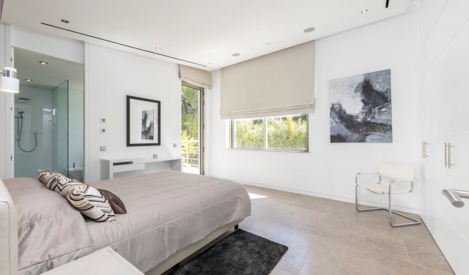 The first floor level of the villa comprises of the master double bedroom with en-suite bathroom, separate dressing area and a spacious terrace overlooking the pool with 2 sun loungers, and 2 further guest bedrooms: one double bedroom with en-suite bathroom, and a double bedroom with walk-in shower and a terrace overlooking the pool and garden