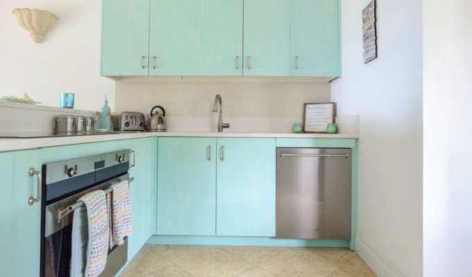 Head upstairs for the main living area, kitchen and the third bedroom - all with beautiful views of the ocean! The large bedroom reflects the beautiful and calm blues and aquas of the ocean beyond. The bedroom leads out to a private balcony and if you fancy a swim just head down the spiral staircase to the pool. The large bathroom is just off this bedroom.