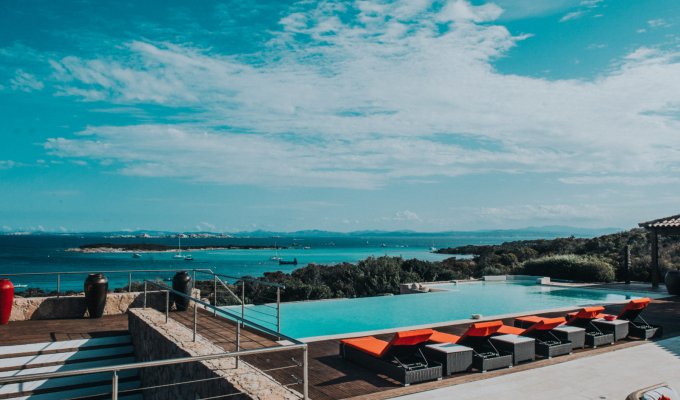 Located near the famous Golfe de Spérone, sumptuous villa offering an area of about 500 m², with a breathtaking view of the sea and the island of Cavallo, fully air-conditioned, 8 bedrooms, capacity 16 people.