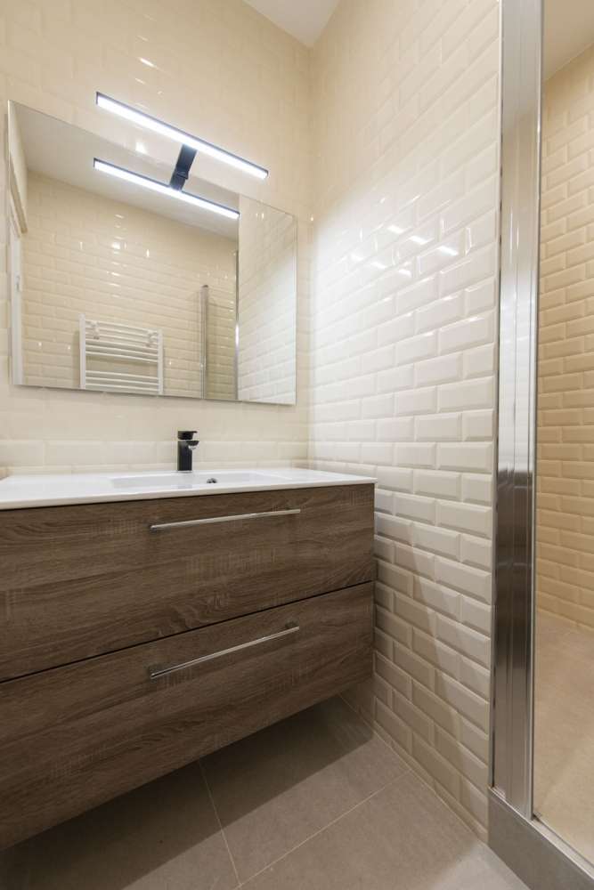 Adjoining the first bedroom, shower room with walk-in shower, sink, hairdryer.