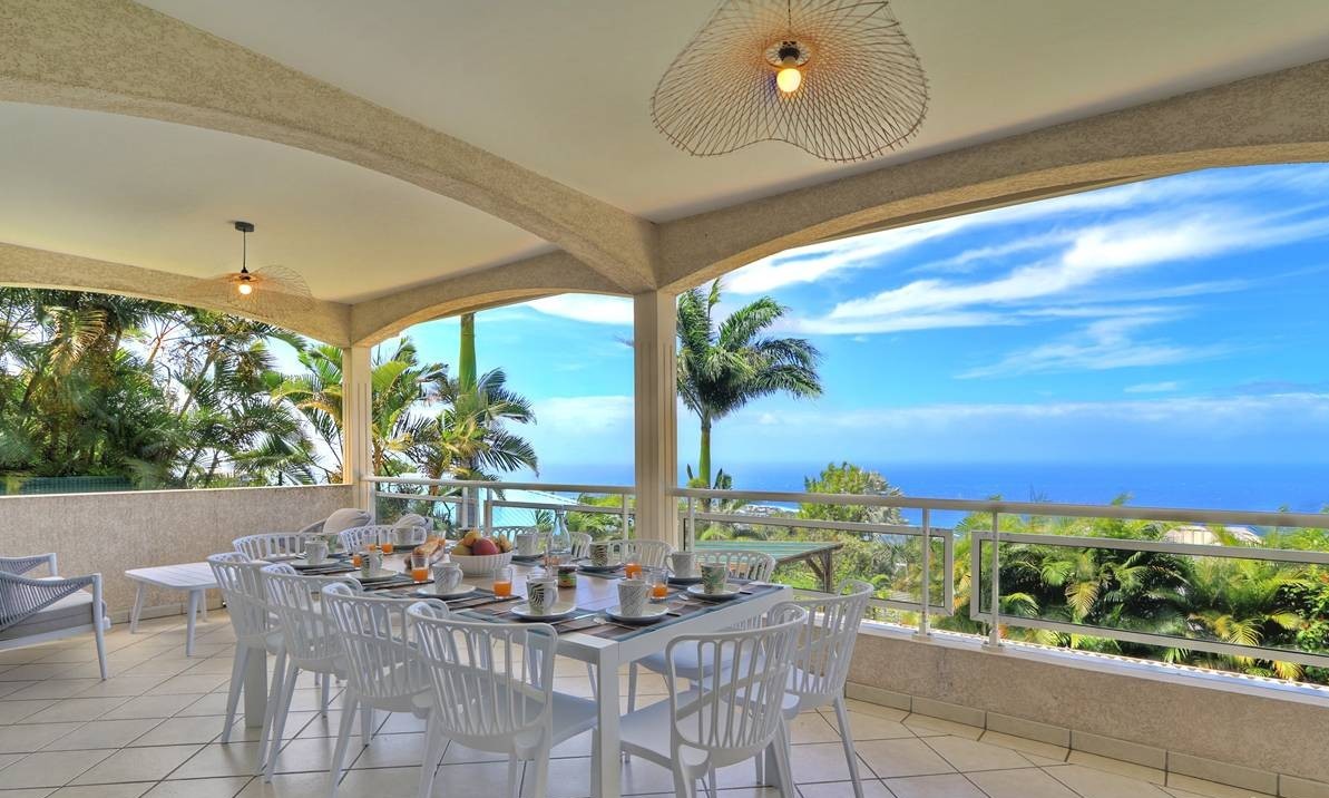 Between the sea and the mountains in Les Avirons, the villa promises a sumptuous view of the Indian Ocean.