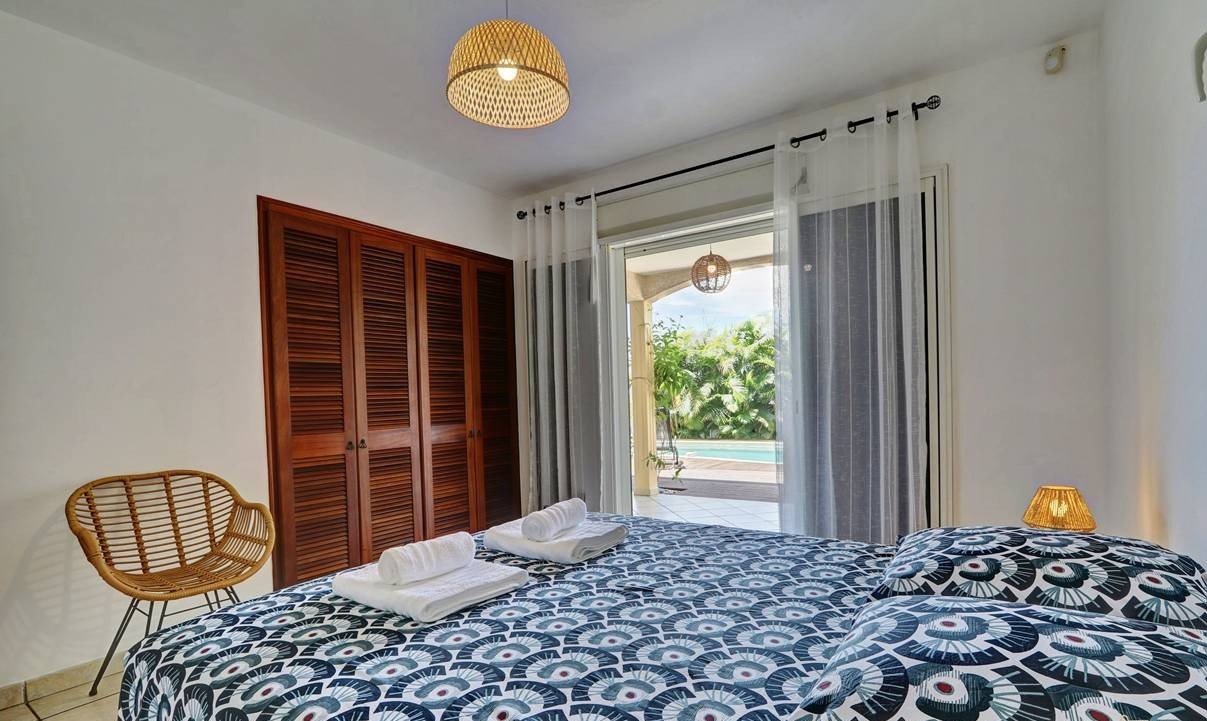 - 3 bedrooms with double beds 160 x 200cm, cupboards, access to the terrace and view on the pool