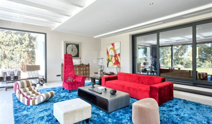 This modern villa enjoys complete privacy. Each bedroom is south-facing and the aspect provides views to the sea, and mountains. The villa has 680m2 living area, on a plot of 5000m2. The villa has 5 bedrooms of which 2 are independent suits, it enjoys wonderful first quality materials throughout, and is fitted with A/C hot & cold in all the rooms, fire place, satellite television, alarm, automatic irrigation and illumination system in the garden.