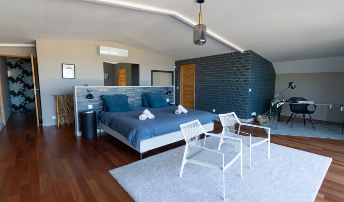 - One master suite upstairs: offering breathtaking sea views, the master suite has a king-size bed (200x200 cm), a work area, and a luxurious bathroom with shower, double sinks, bathtub, separate toilet, and dressing room.