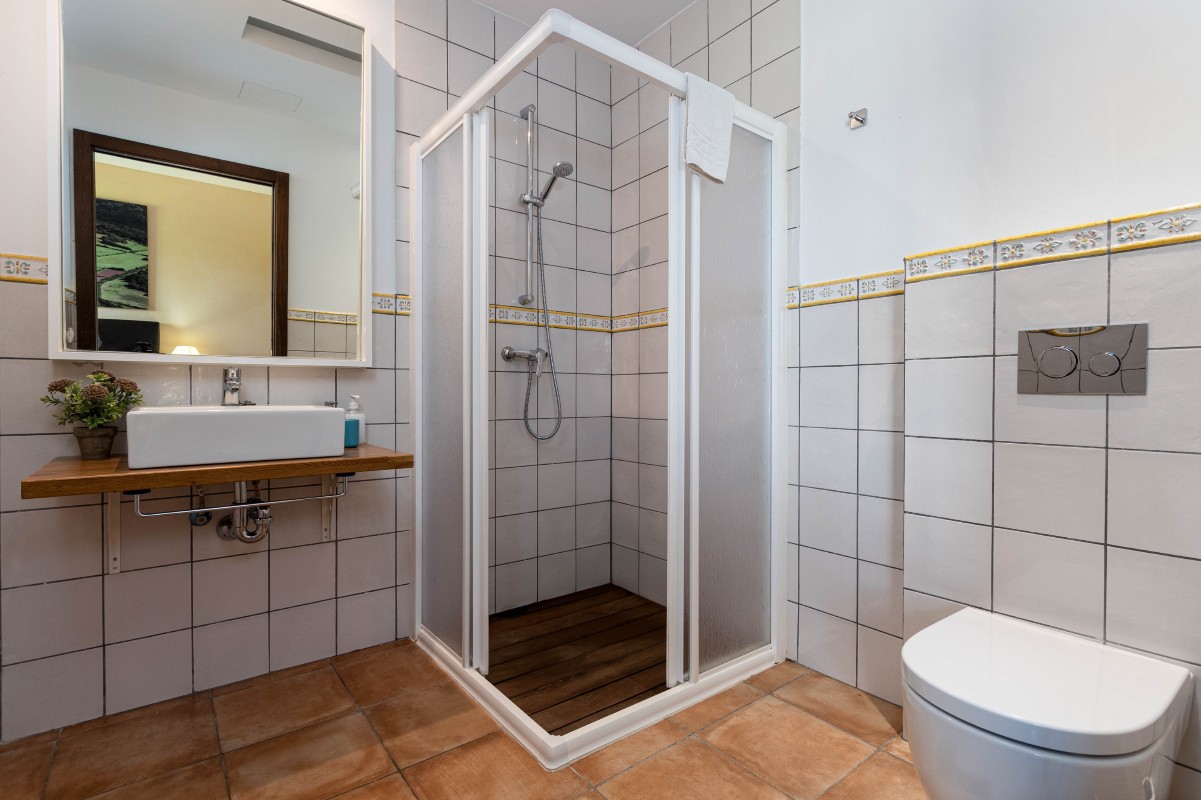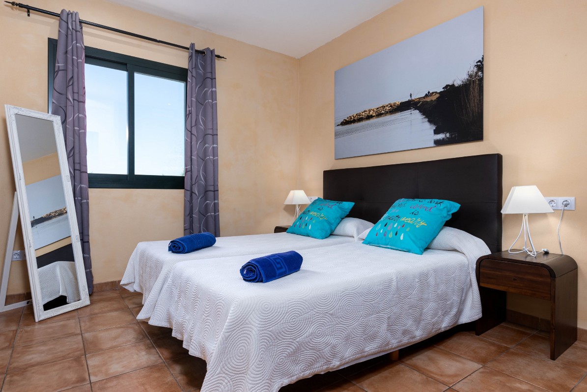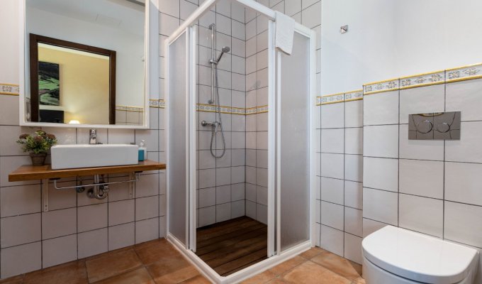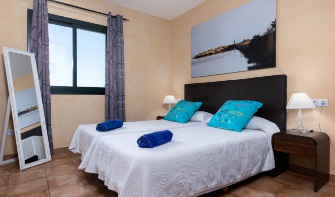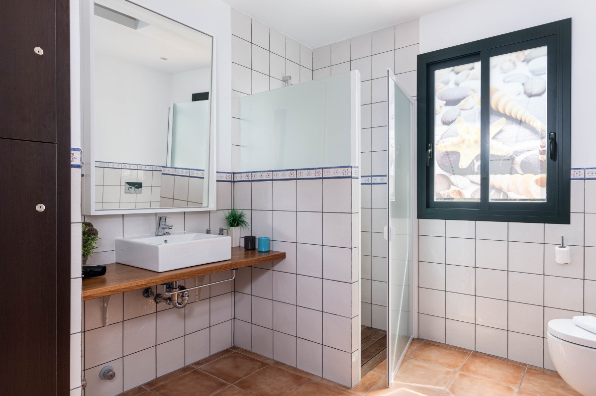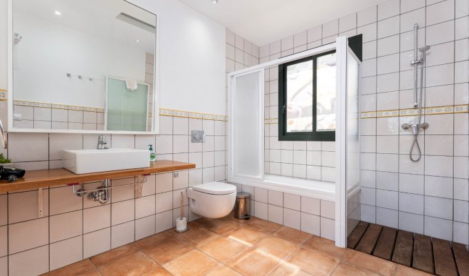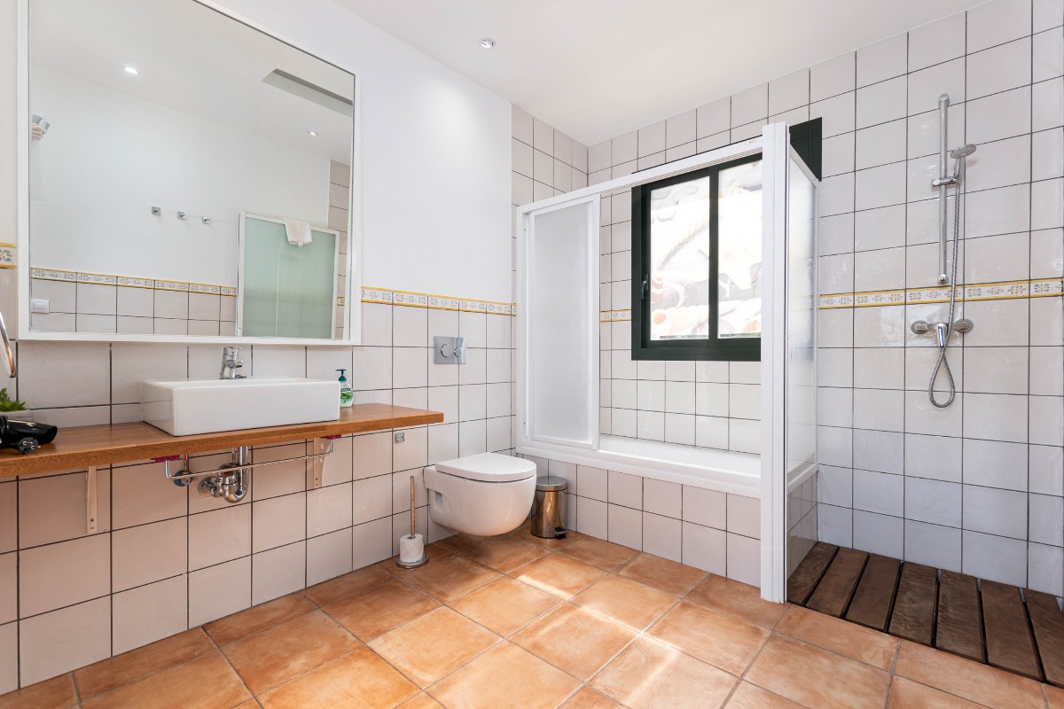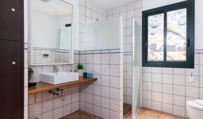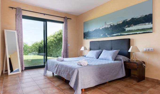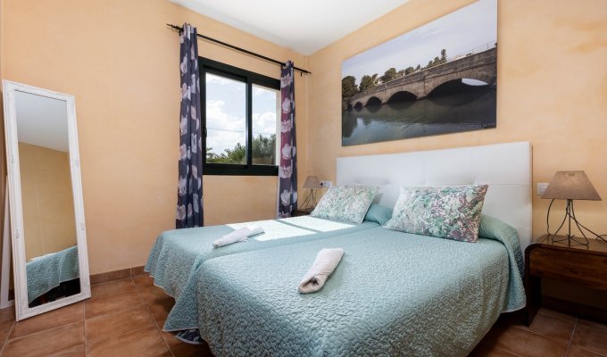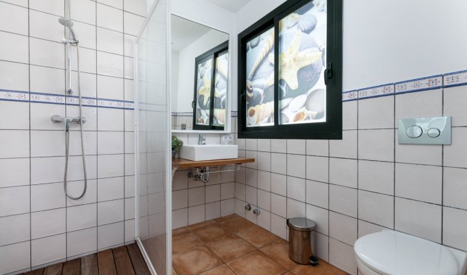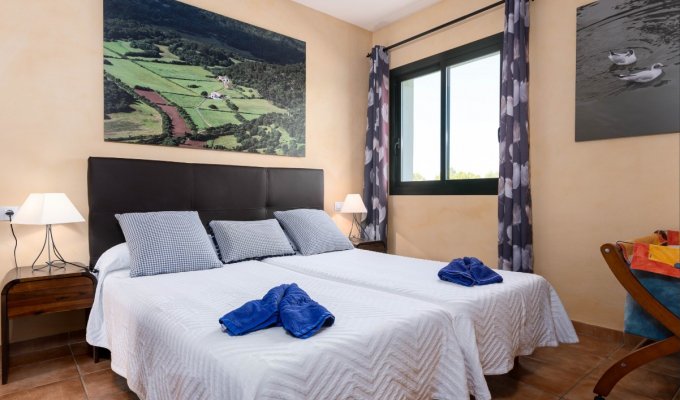 The private, 4,5 x 8 meter sized salt water pool is surrounded by a sun terrace with BBQ, loungers and parasols and has a depth of 1.6 meters. The furnished porch leads you to the living-dining room with open kitchen, including a vitro hob and satellite TV. All four bedrooms come with 2 single beds and 3 of them have a bath en-suite. Besides, there’s another, individual shower bathroom. The house counts with centralized air conditioning system, WiFi, hair dryer, a washing machine, a tumble dryer and a safe.