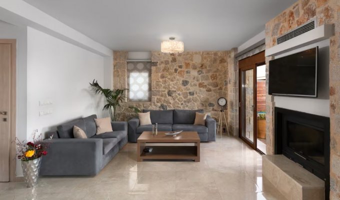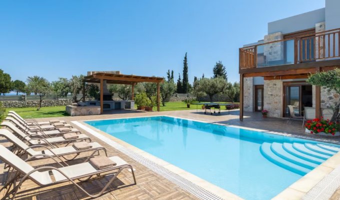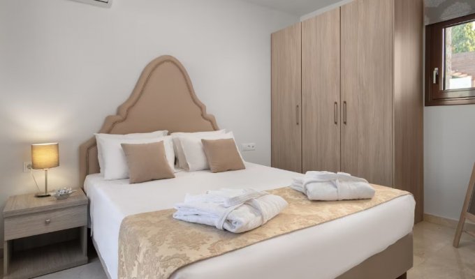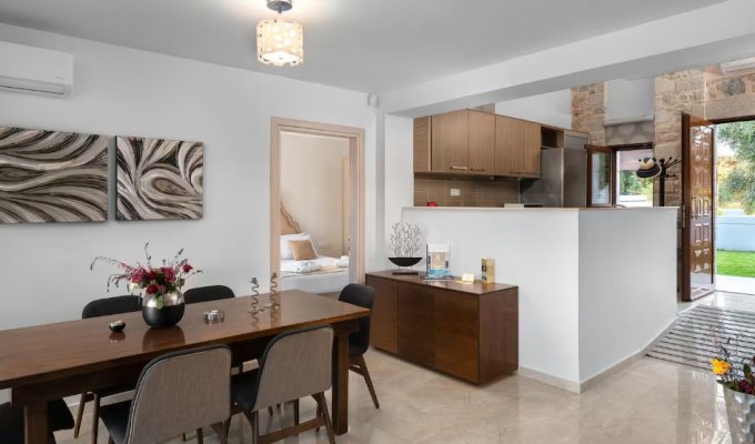 Located in the unspoiled Trapezia–Kolympia area, this exclusive estate comprises four semi-detached villas, each featuring a large private pool, barbecue, and a landscaped garden of 600 m².