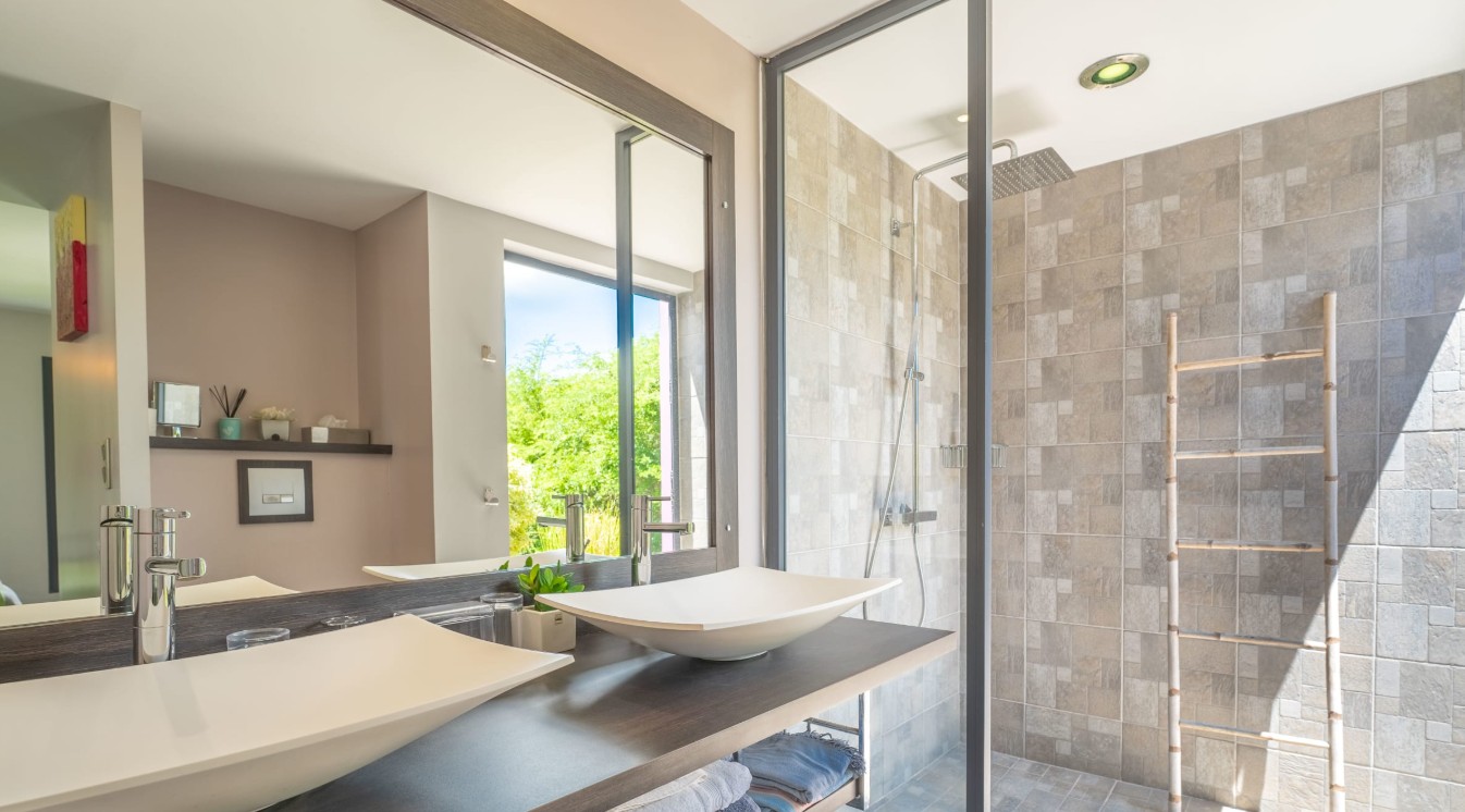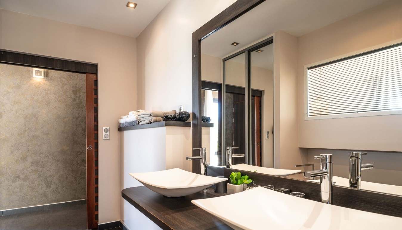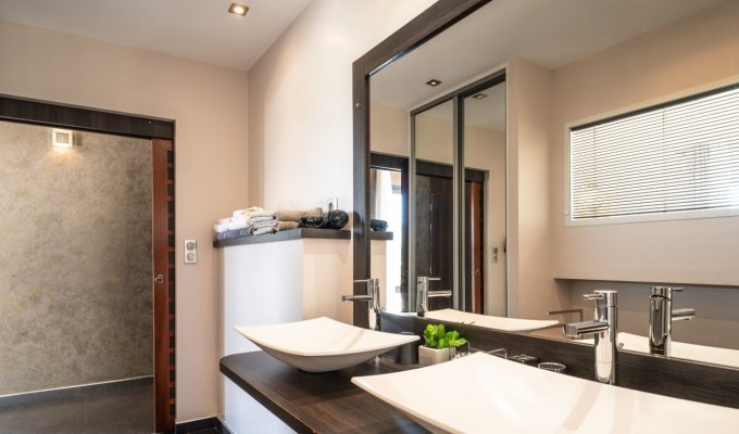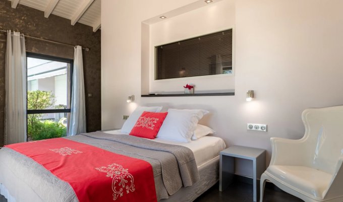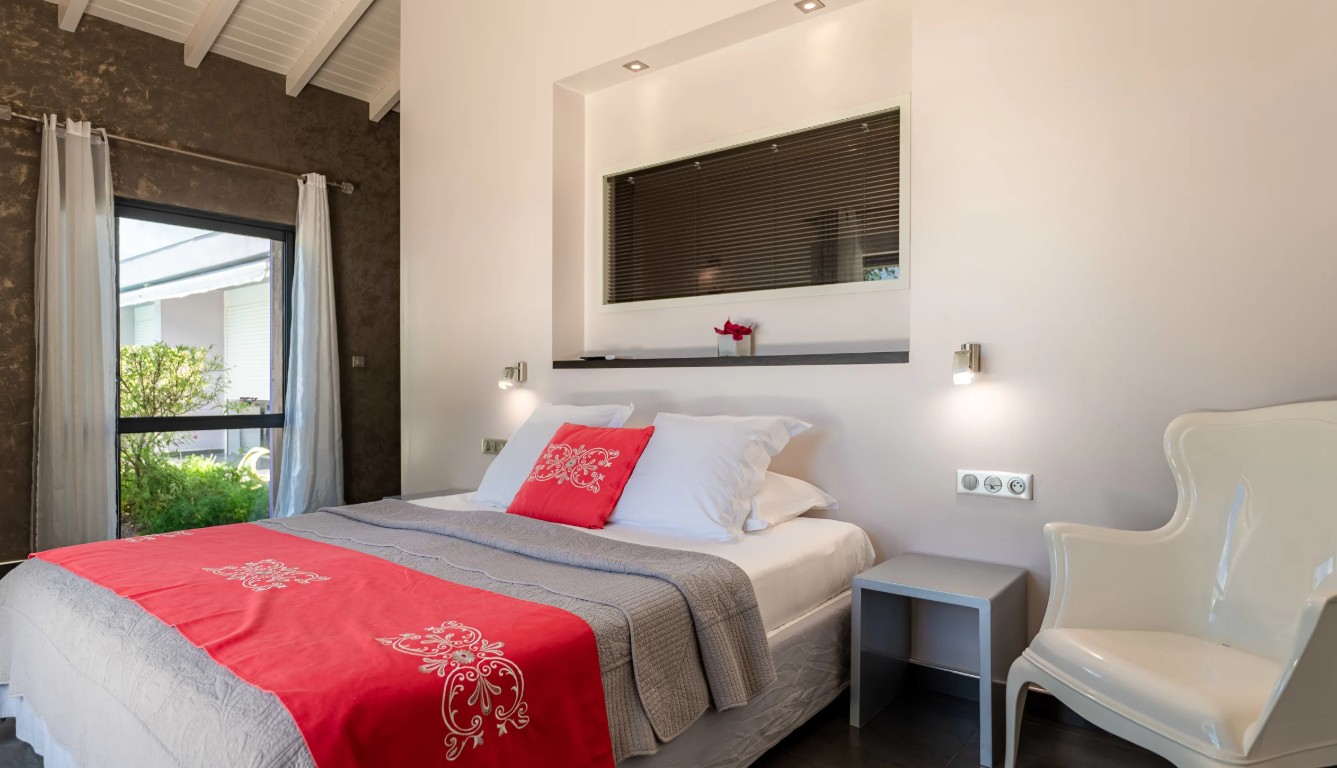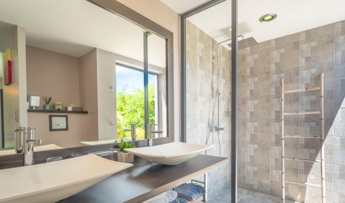 The villa features four bright, air-conditioned bedrooms, each with its own private bathroom and walk-in shower. High-end bedding and harmonious décor guarantee peaceful nights in a tranquil setting. The fully equipped kitchen will delight food lovers and includes a wine cellar, perfect for enjoying convivial evenings.