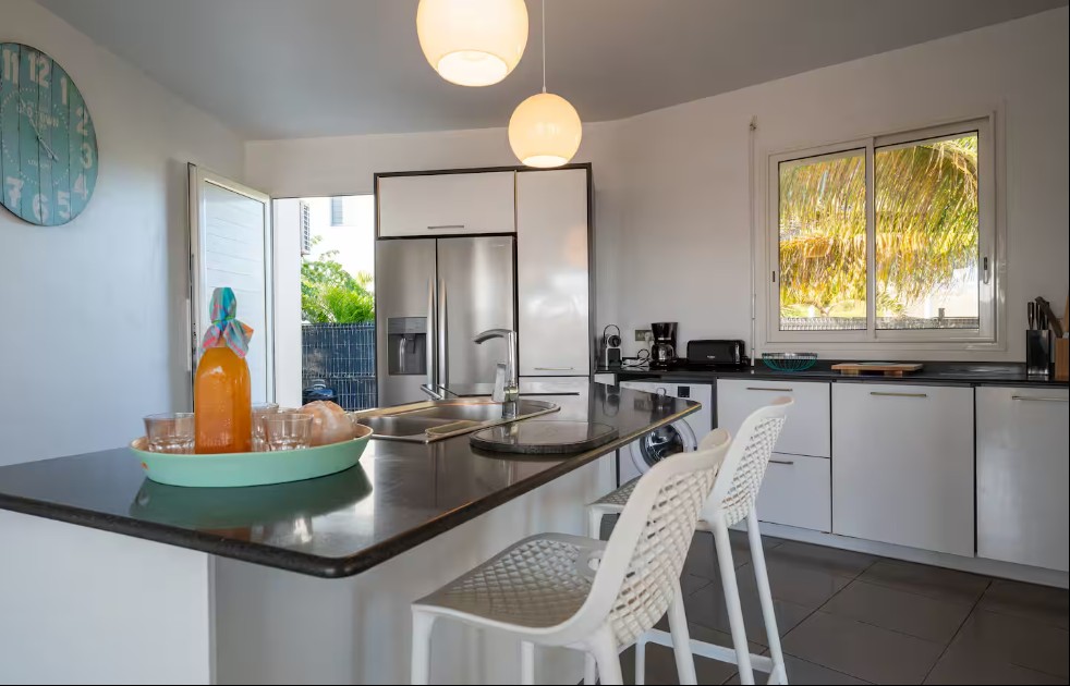The villa is located in the commune of Sainte Anne, on the eastern part of Guadeloupe known as Grande-Terre. It’s a 40-minute drive from Pointe-à-Pitre Airport, and it will take you less than 5 minutes to reach the village of SAINT ANNE, where you’ll find all the amenities: shopping area, supermarket, bakery, pharmacy, and a market for fruits, vegetables, and spices.