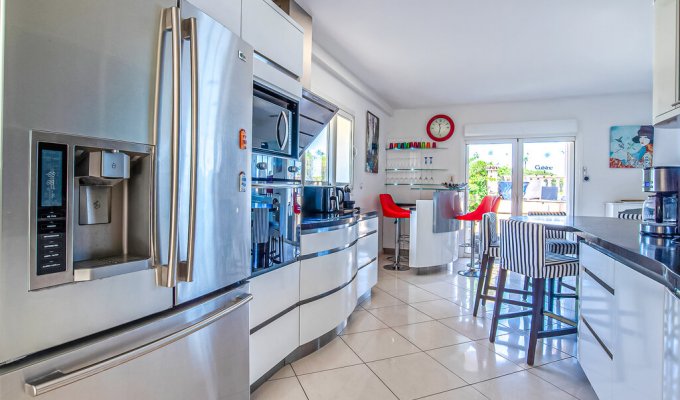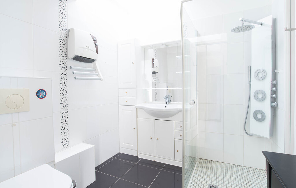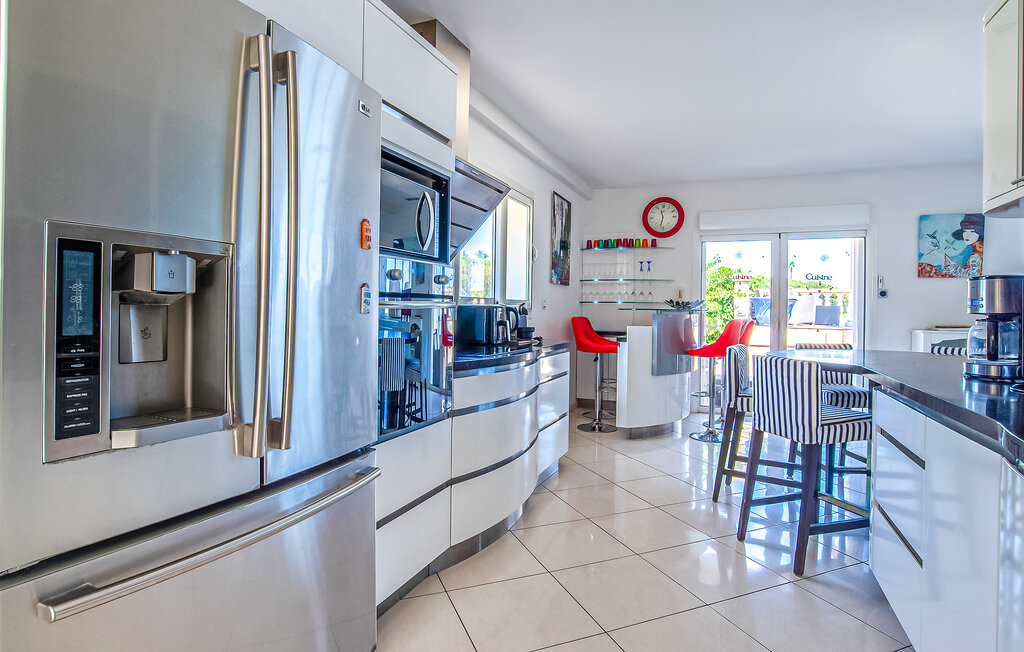This bright and spacious villa welcomes you in a lush and idyllic landscape and enchants you with its comfortable amenities and fresh, modern atmosphere. Create culinary highlights here and take a seat in the open and inviting living area. Organize friendly game nights on the comfortable sofas or retreat to your favorite spot with your holiday reading.