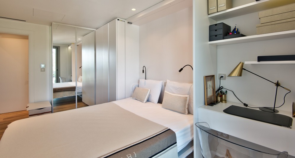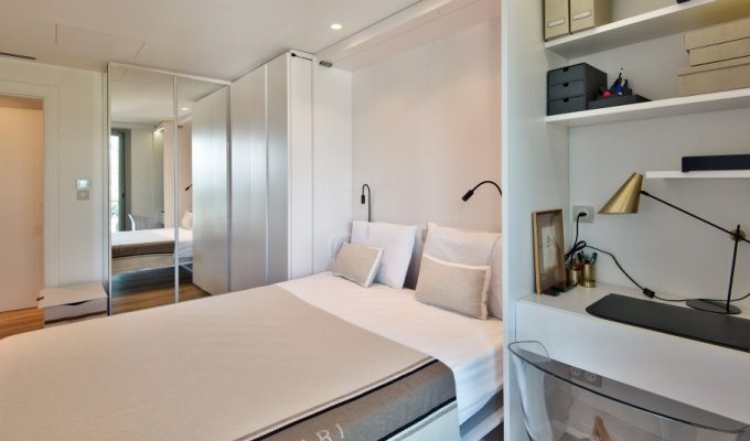It consists of an entrance, a living room with dining area, an open kitchen, a master bedroom, a guest room with a fold-down bed that can serve as an office, and two shower rooms with WC.
