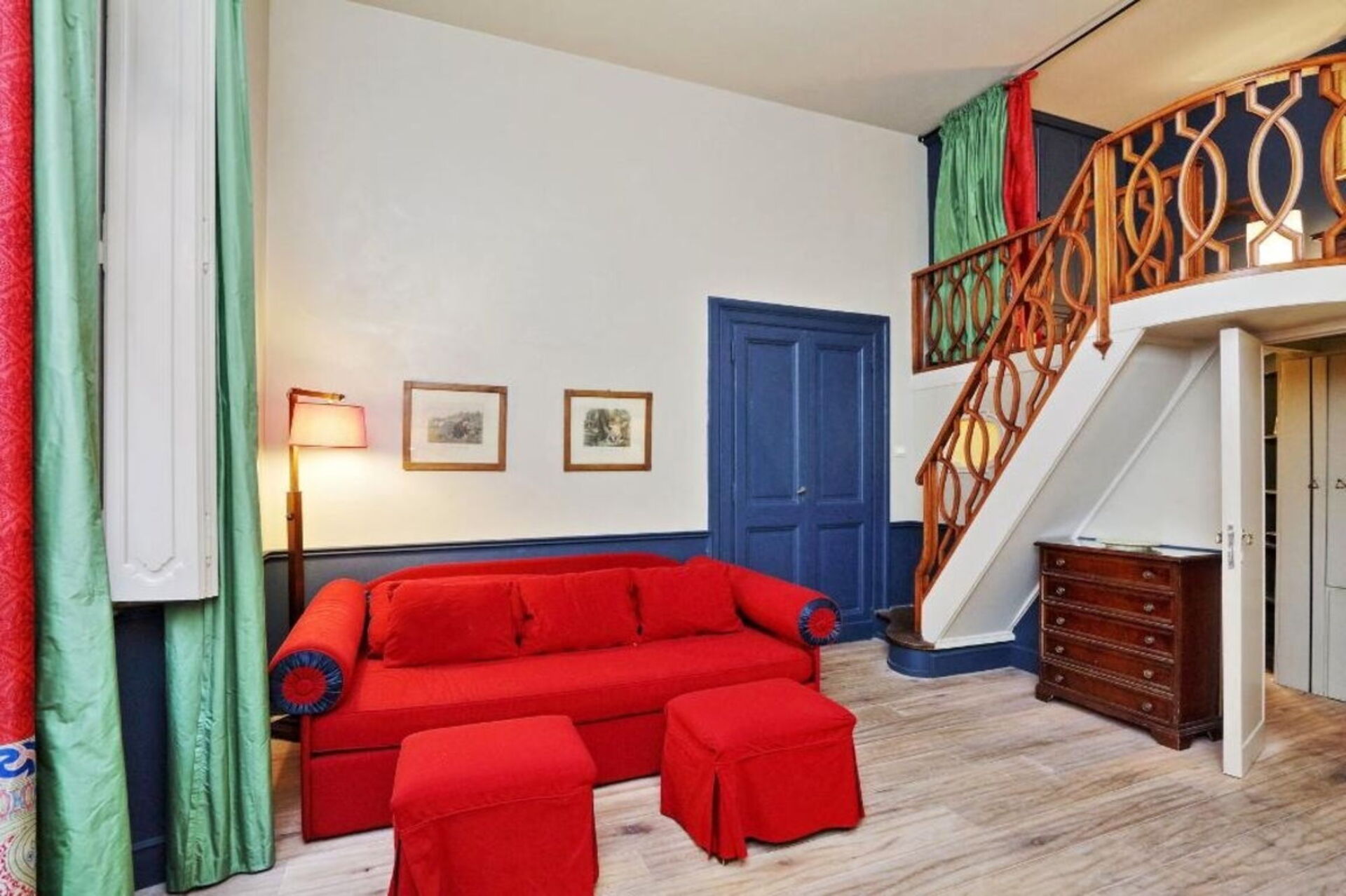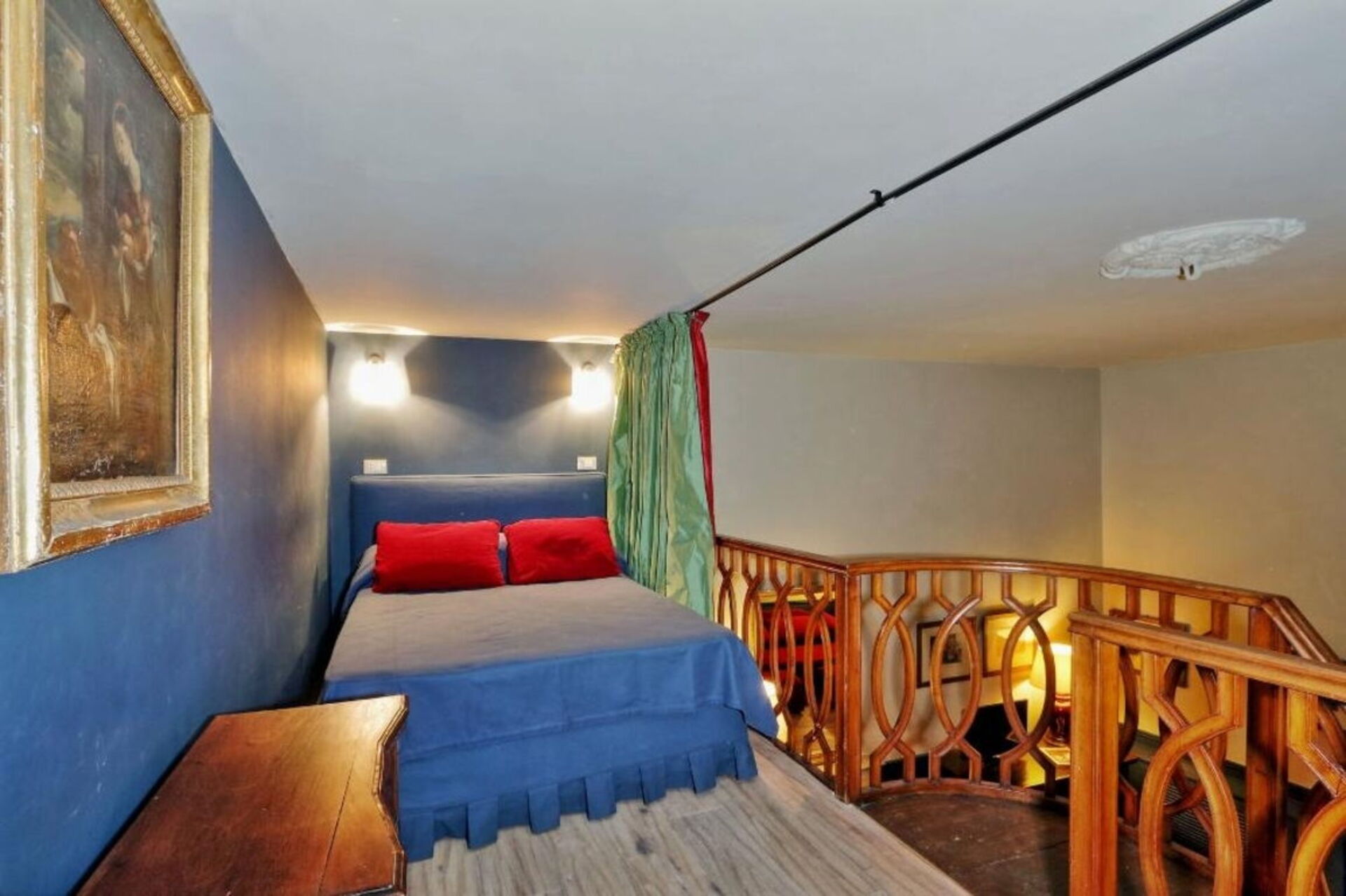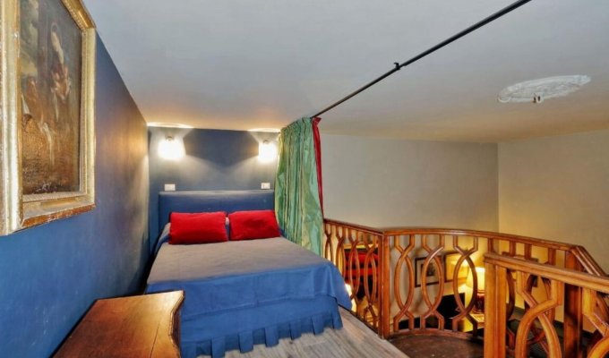 A wooden staircase leads to the mezzanine: the night area is furnished with a double bed (140cm x 190cm) and an antique closet.