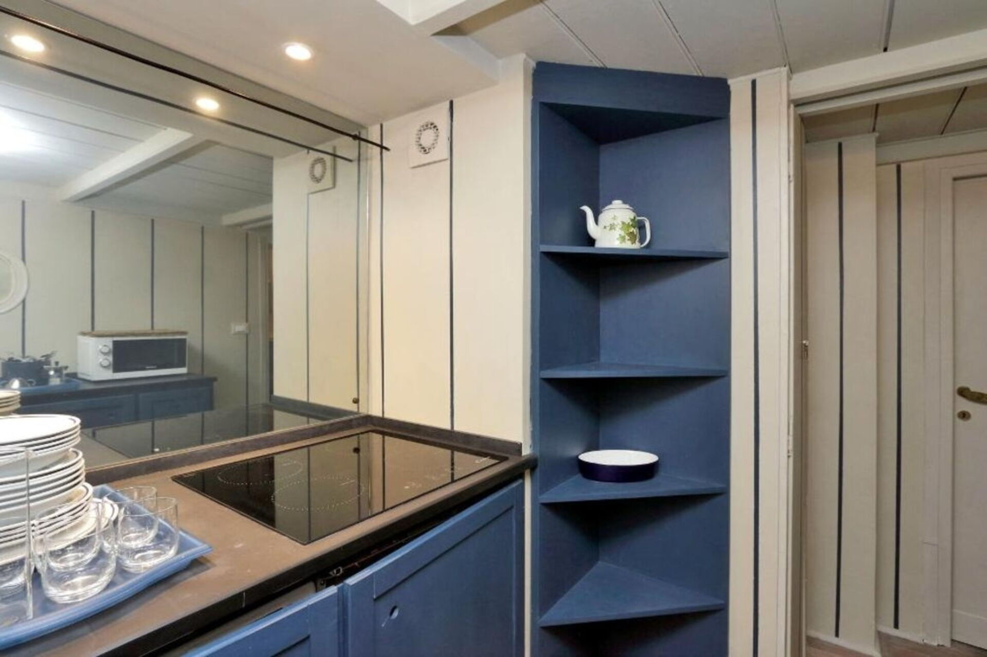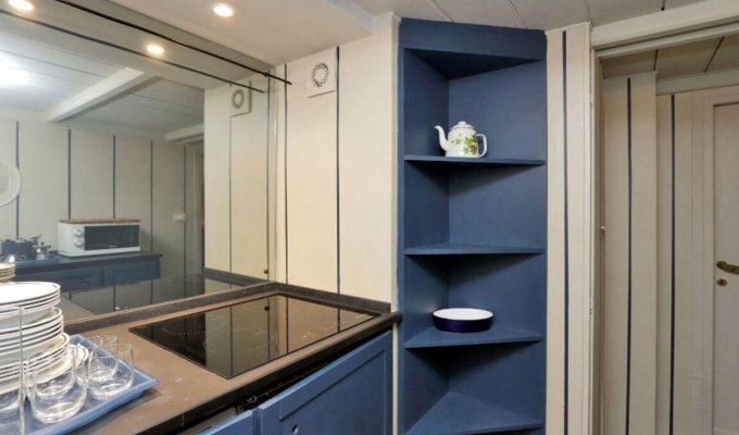 The sitting room offers a comfortable sofa, a TV set, a round table with 3 chairs and a lovely fireplace. From the living area you enter the small kitchenette, fitted with fridge, dishwasher, washing machine, microwave, electric hobs and tableware for 6 people.