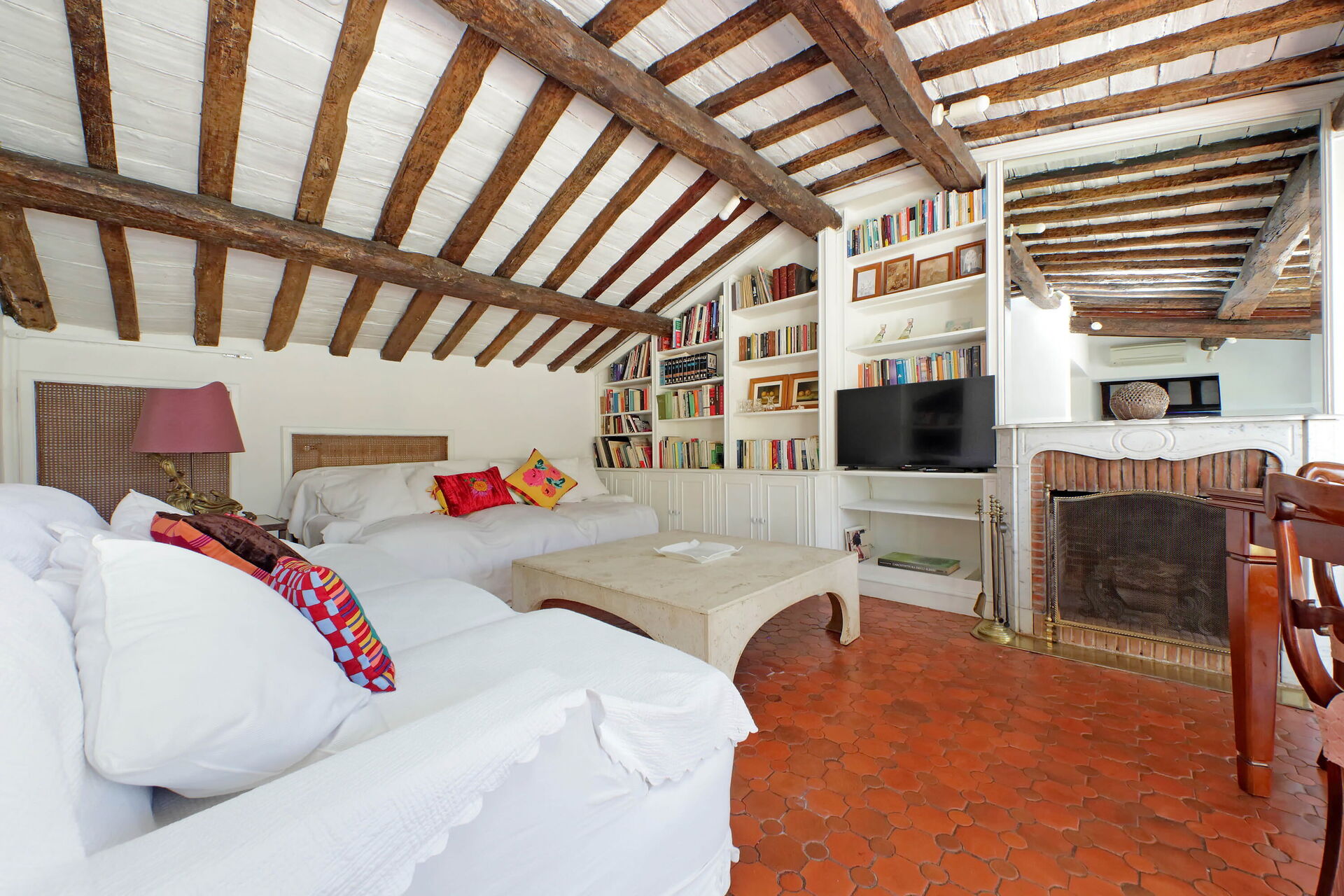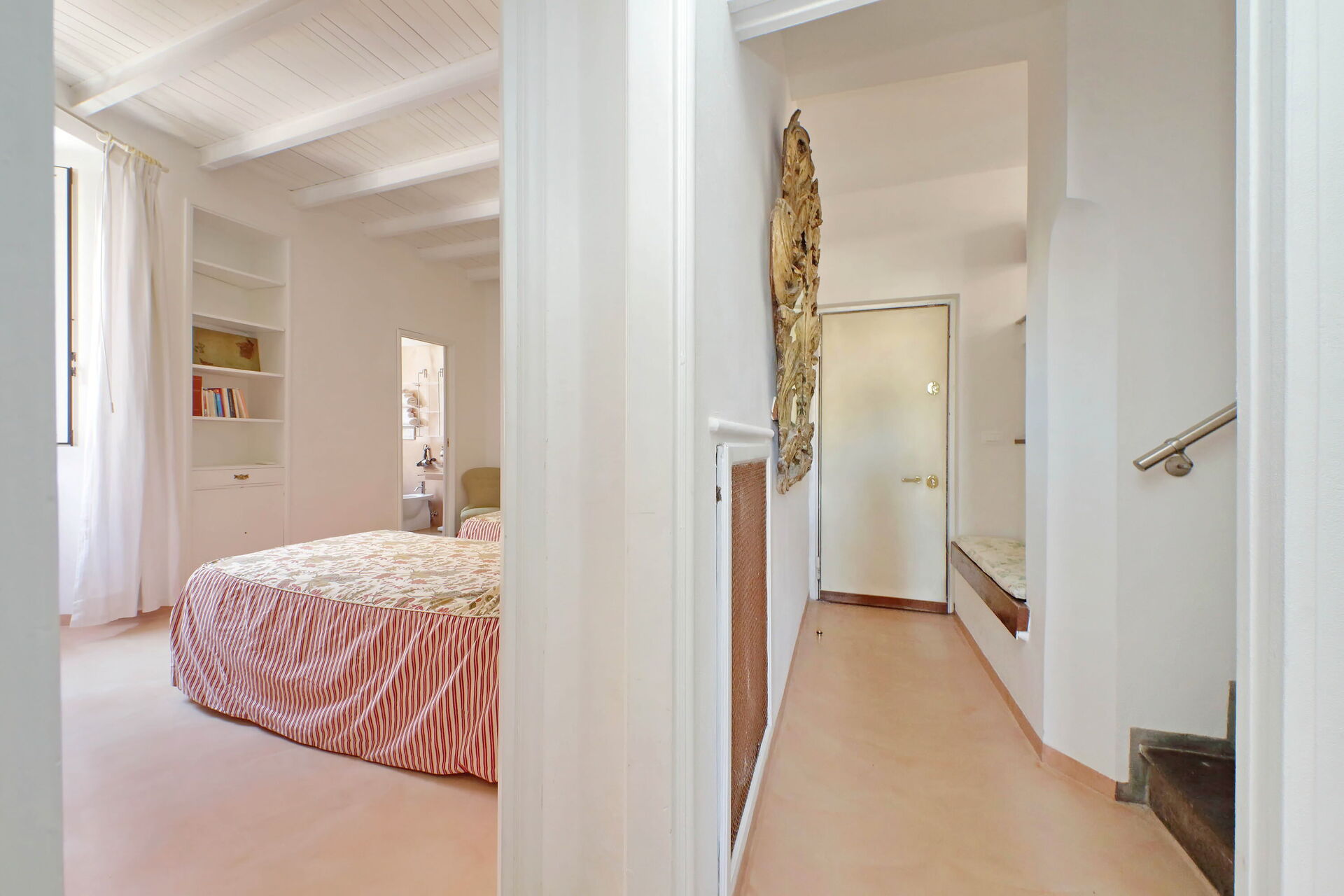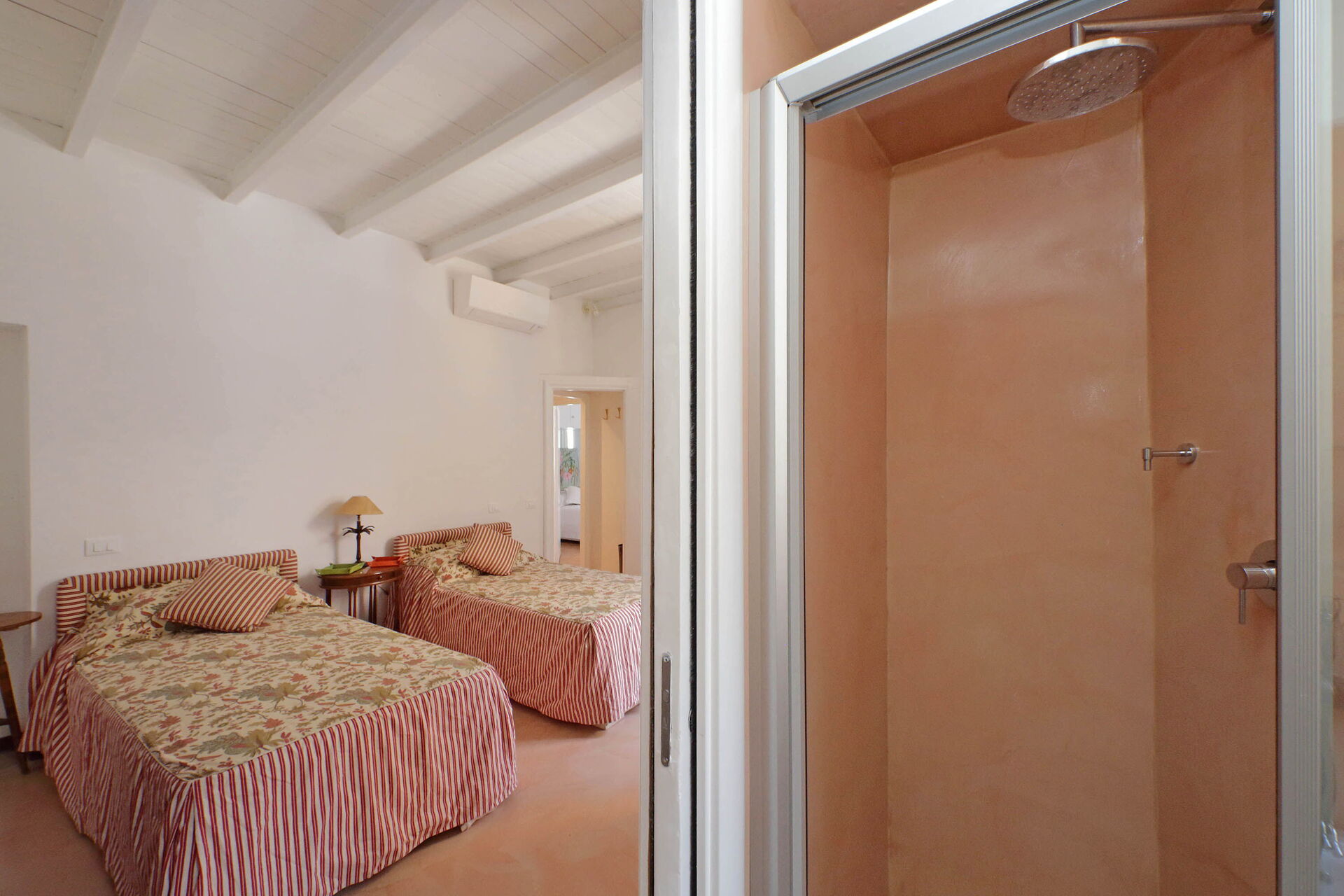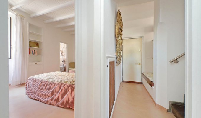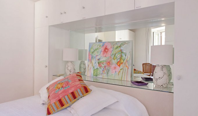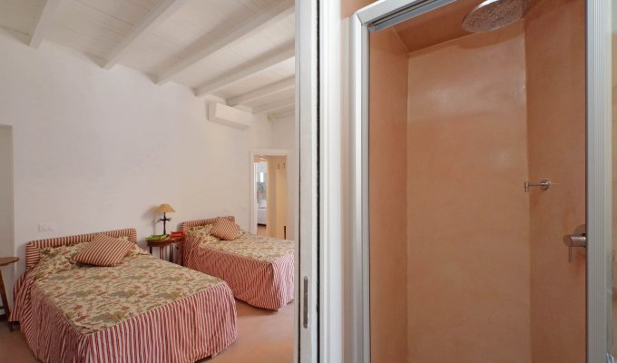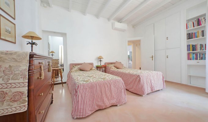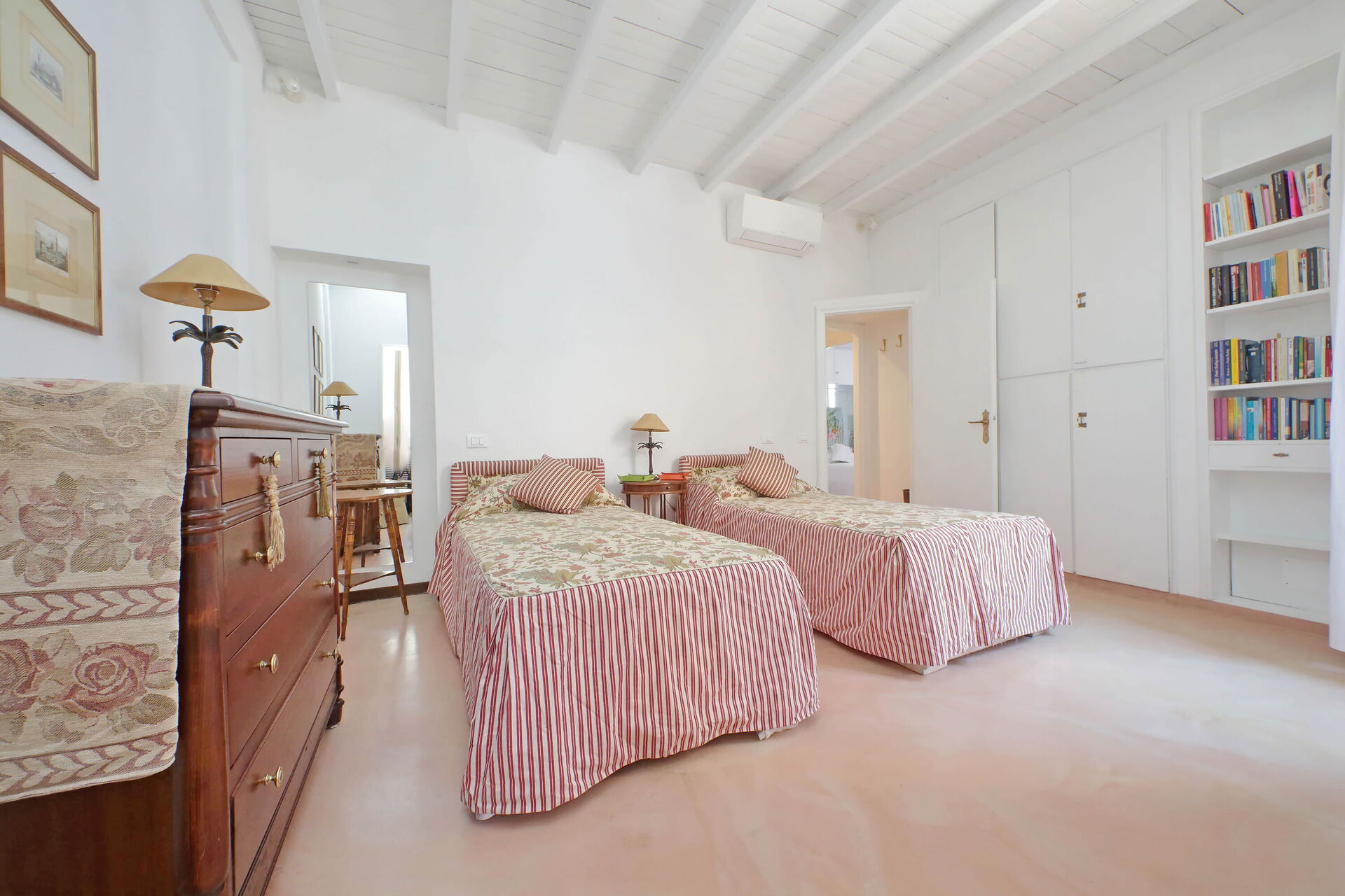 Both bedrooms are on the first floor. The first bedroom, with an en-suite bathroom, is furnished with two single beds (190 cm x 90 cm) that can be joined to form a double bed. The first bedroom has a bedside table, a bookcase, a wardrobe, an armchair, and a chest of drawers. The second bedroom, also on the first floor, has a double bed (140 cm x 190 cm), wardrobes, an armchair, and a safe. Lamps, mirrors, and paintings complete the furnishings of both bedrooms. Air conditioning is available in both bedrooms.