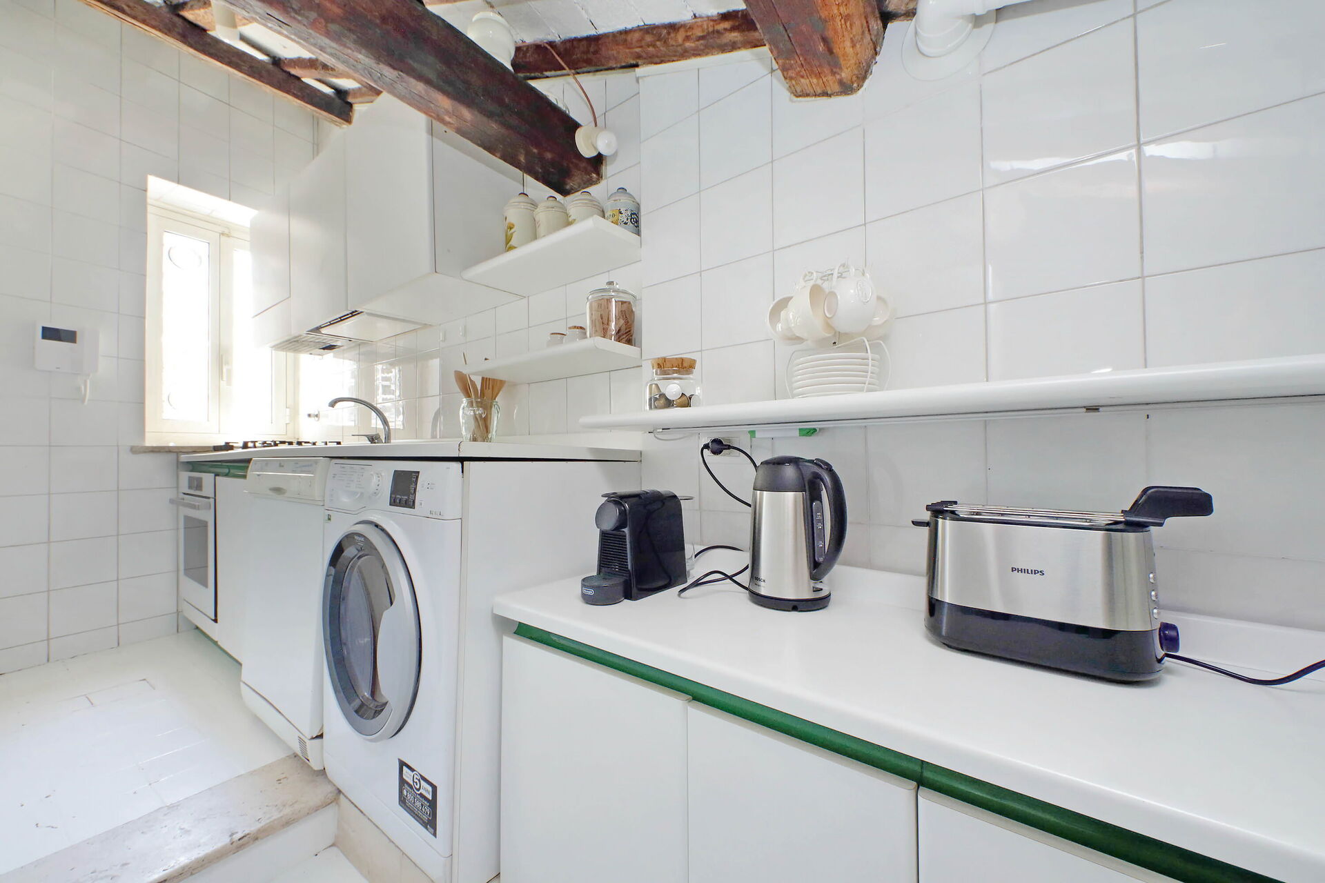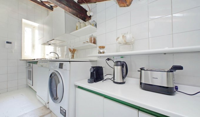 The kitchen, although small, is fully equipped with a refrigerator, stovetop, oven, dishwasher, Nespresso machine, electric kettle, toaster, washing machine, and cutlery and crockery for six people. Part of the kitchen is located on the second floor, in the attic.