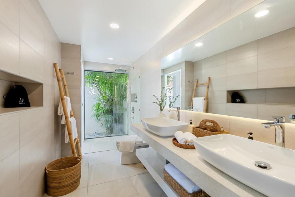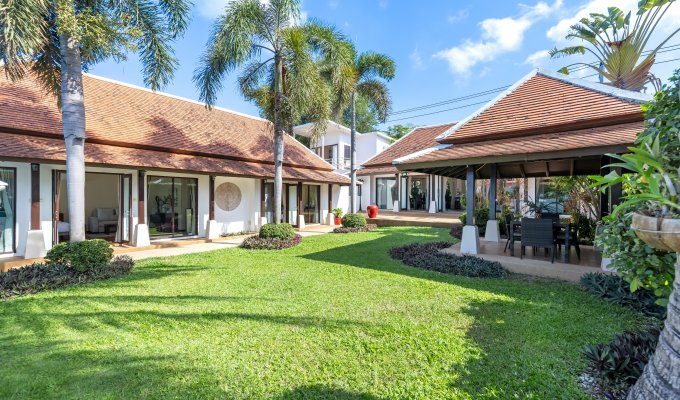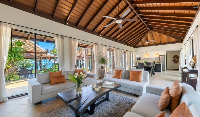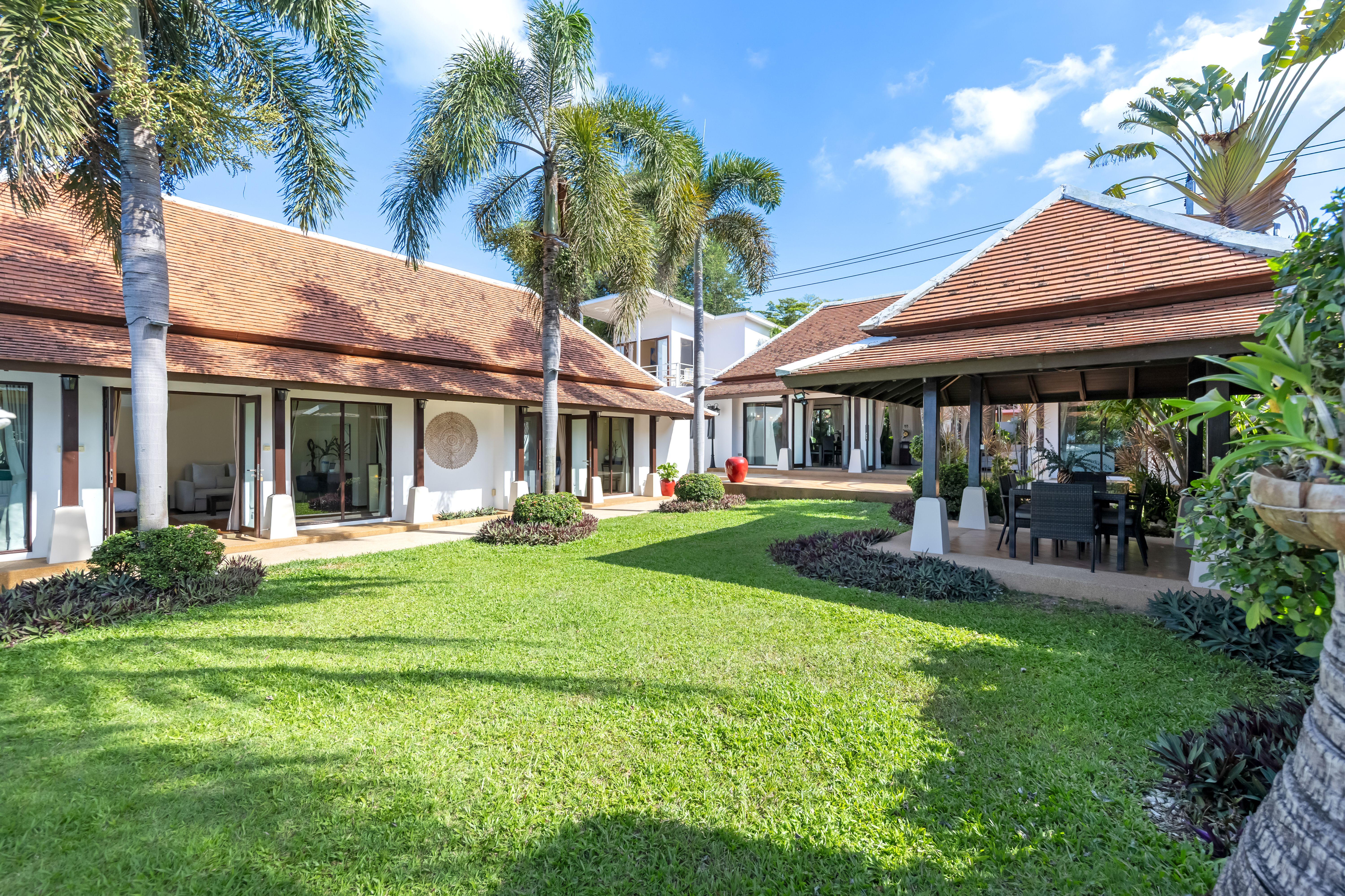 Passing through a lush tropical garden, you are welcomed into an elegant, fully air-conditioned living room that flows seamlessly into an open-plan kitchen, where plush sofas and a large flat-screen TV create the perfect setting to relax with your favorite streaming content; beyond the living area, a charming garden sala awaits—ideal for evening BBQs, family conversations, or simply unwinding in the shade after a refreshing swim.