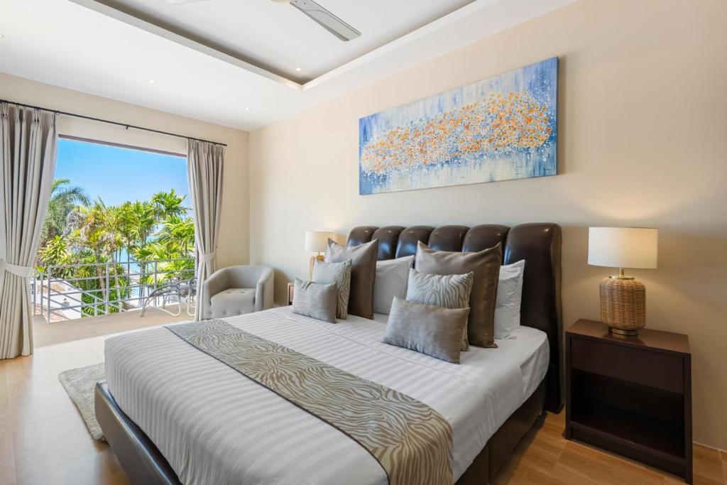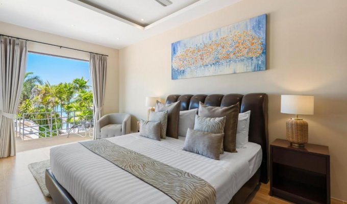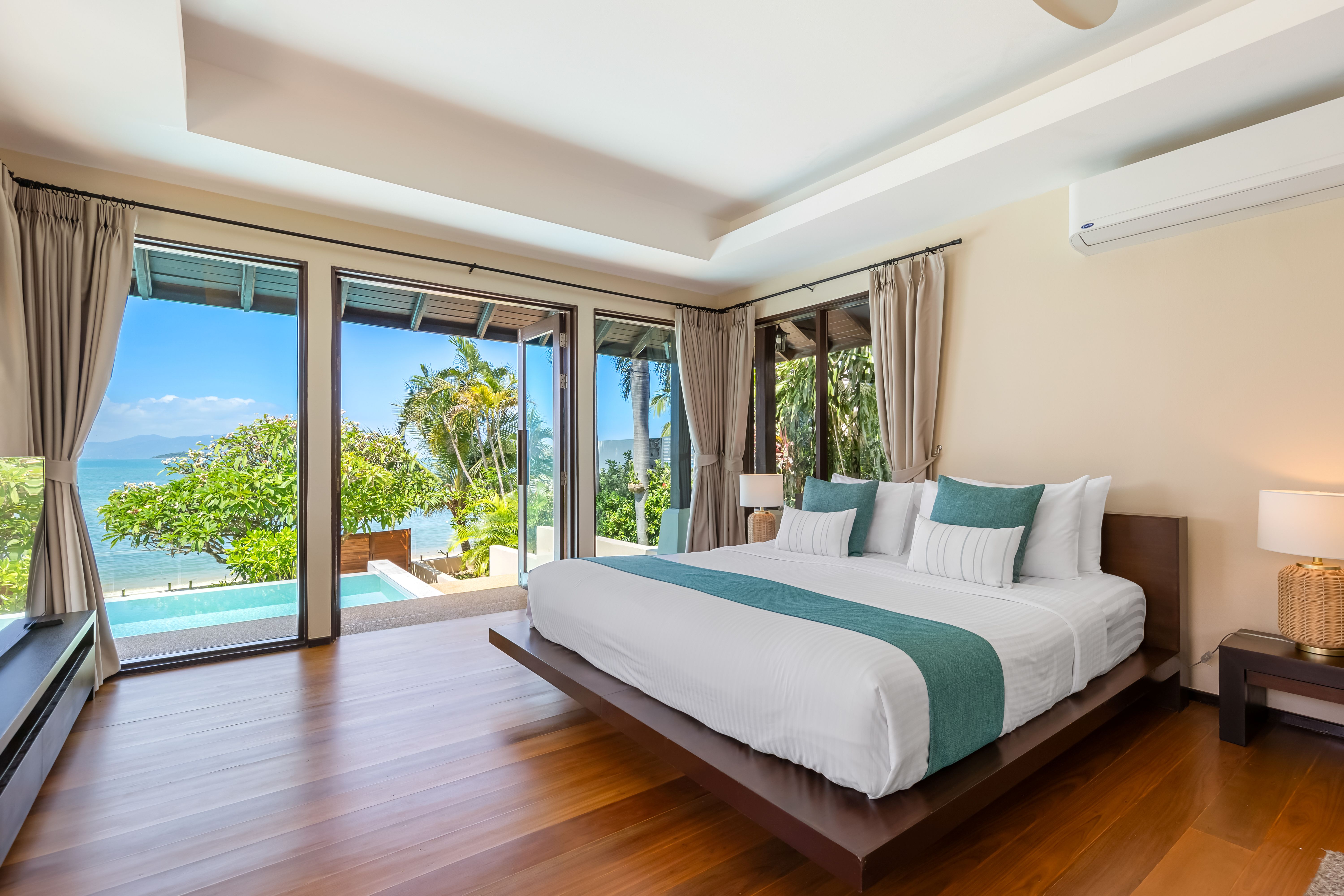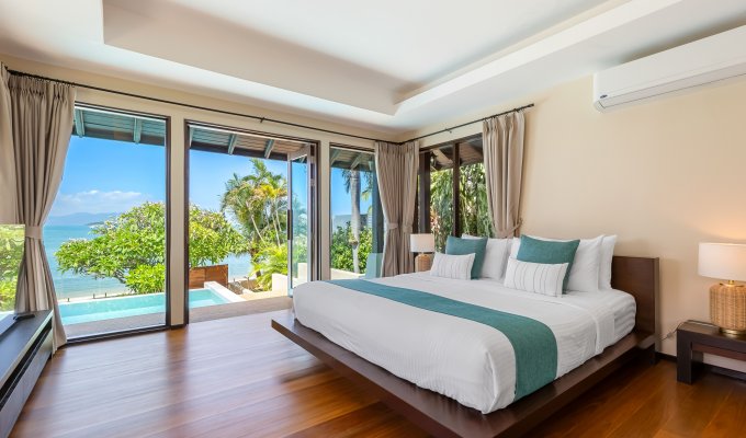 The master bedroom offers panoramic sea views and is just a few steps from the soft white sand.