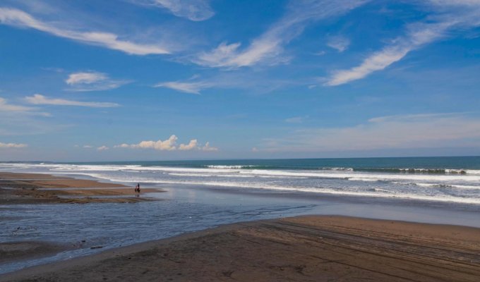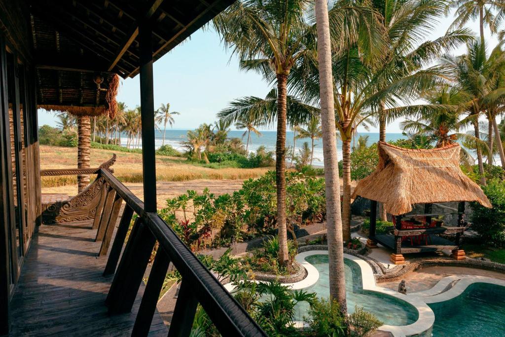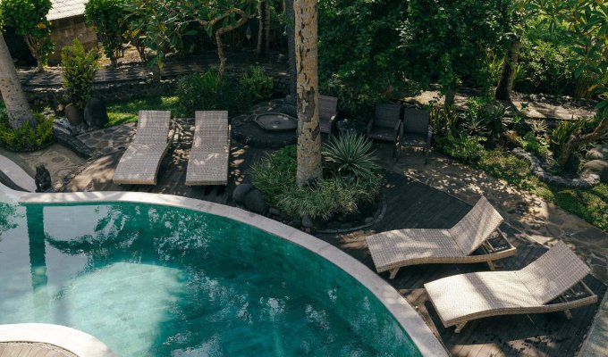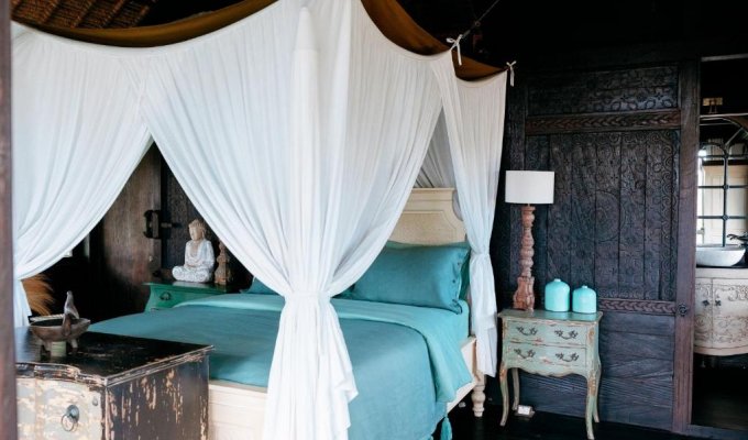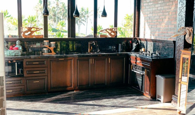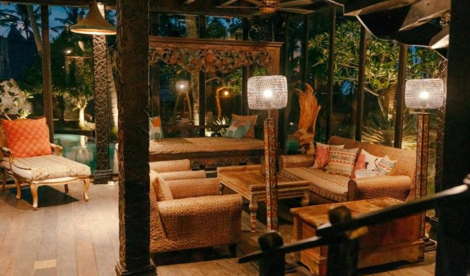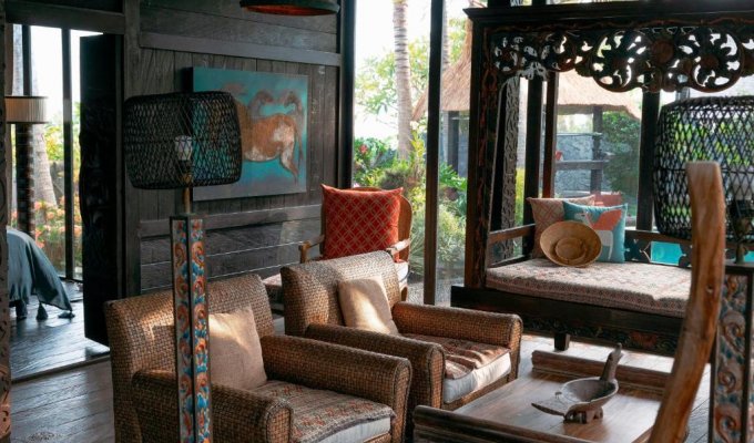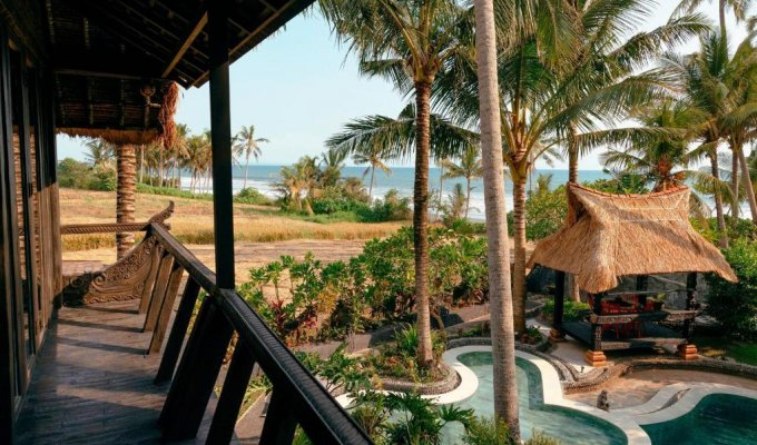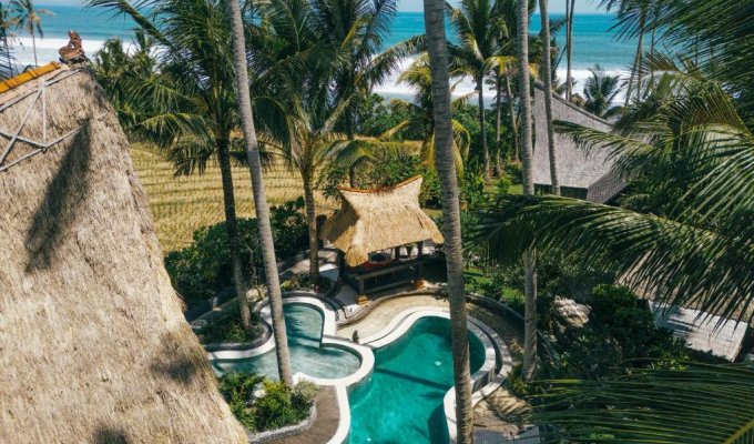 This unique beachfront villa is located just a few meters from a fine sandy beach. It is built in an antique style inspired by the cultural heritage of Sumatra, Kalimantan, and Flores. If you are looking for a peaceful place to relax and wish to stay close to the ocean, surrounded by palm trees and rice fields, this incredible villa is perfect for you.