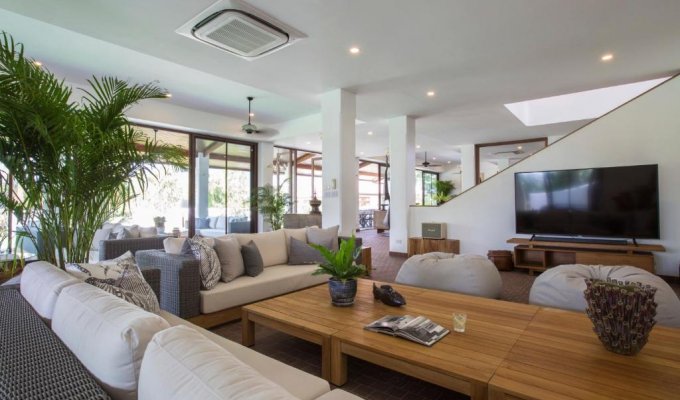 Relax in the spacious family living room with oversized sofas and a 75-inch smart TV with Apple TV & Netflix—perfect for movie nights or unwinding after a day exploring Koh Samui.