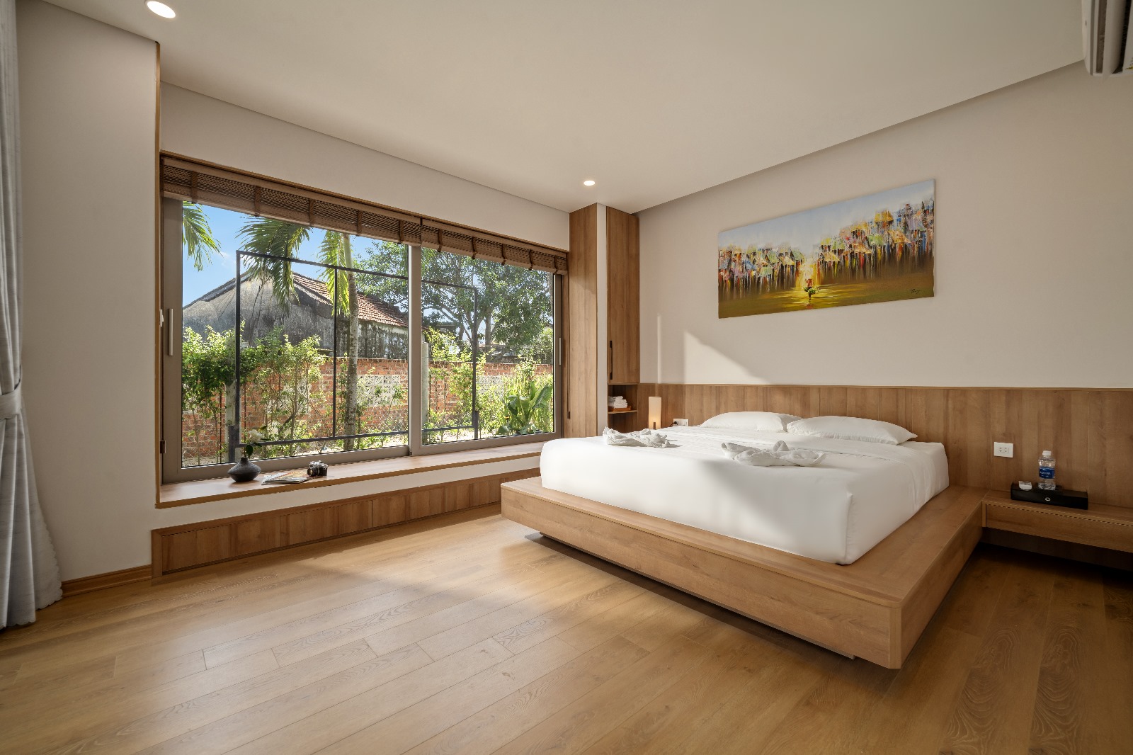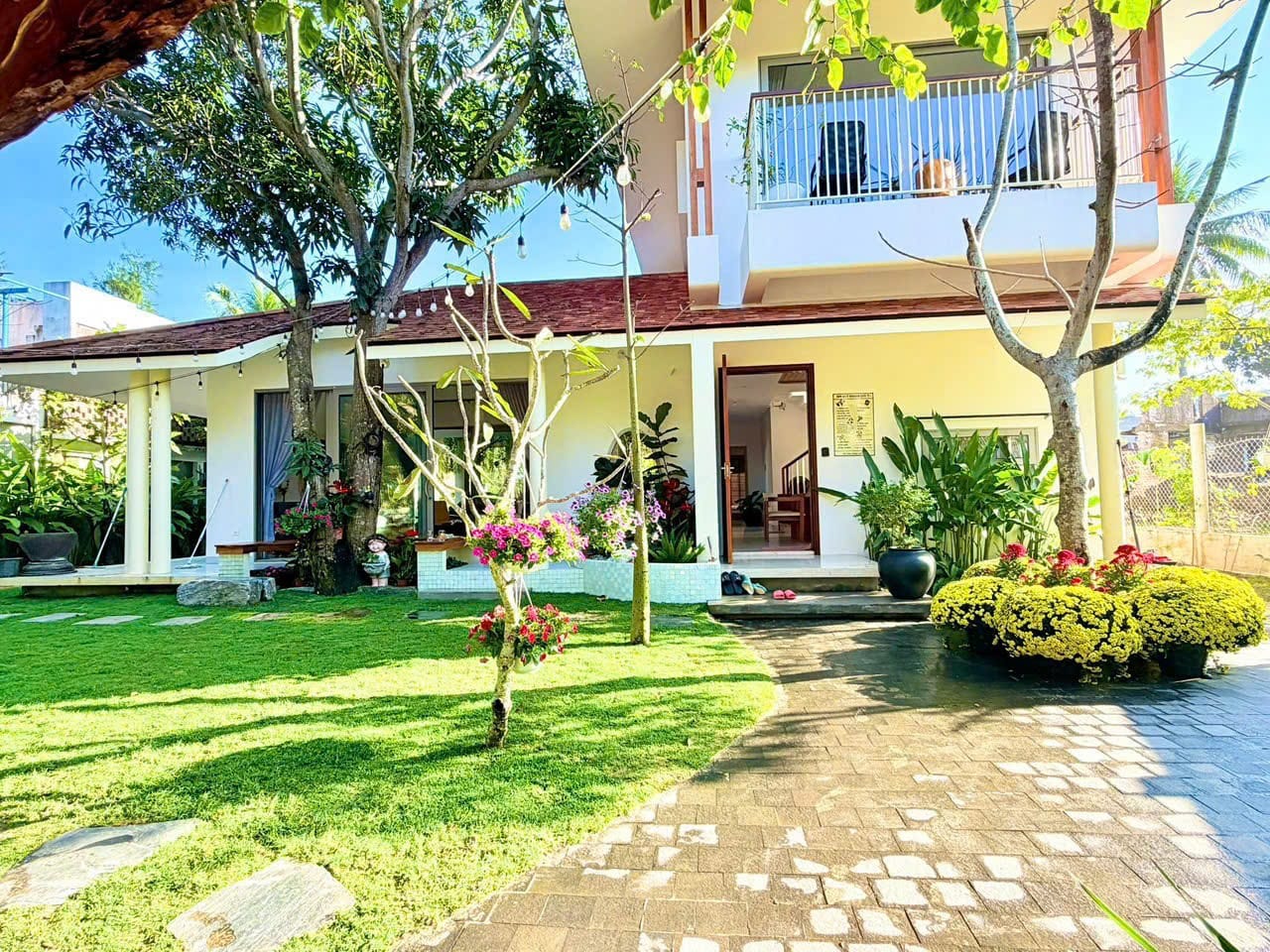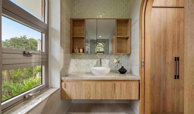 The villa features 5 large bedrooms with en-suite bathrooms (2 with bathtubs). All rooms are air-conditioned and include a balcony or terrace with garden views.