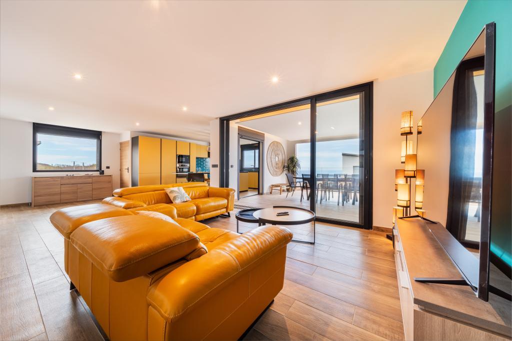 A large terrace with a dining table and outdoor lounge area
