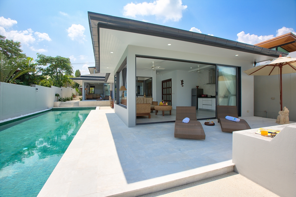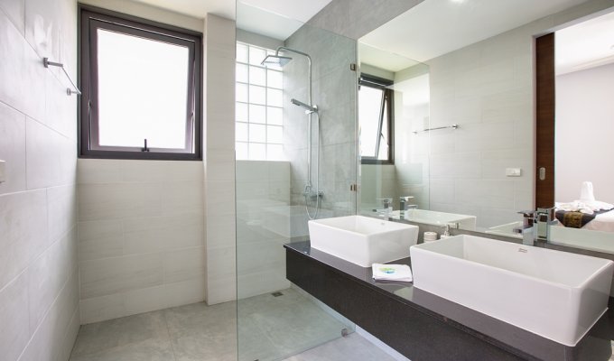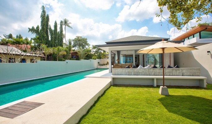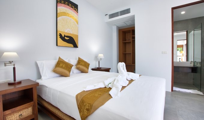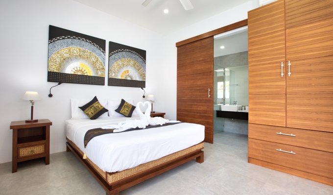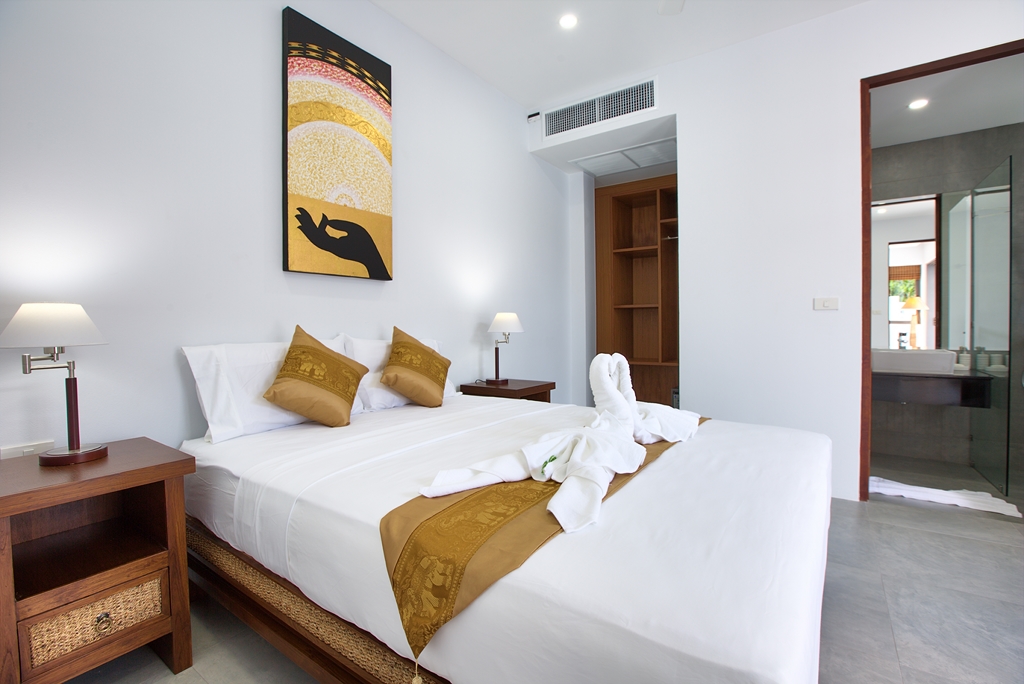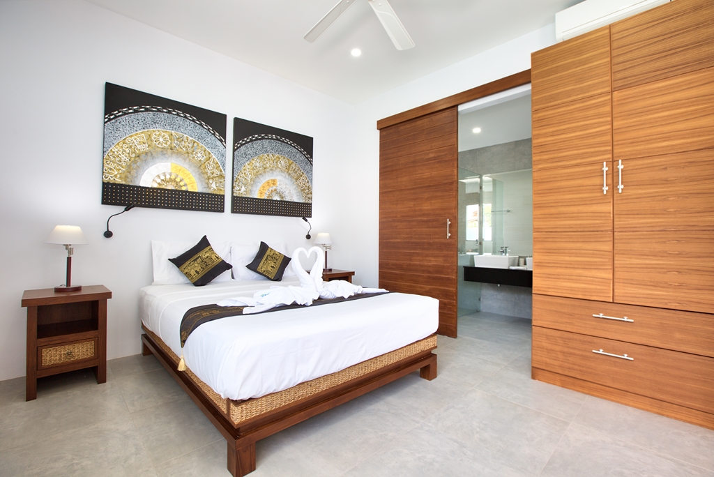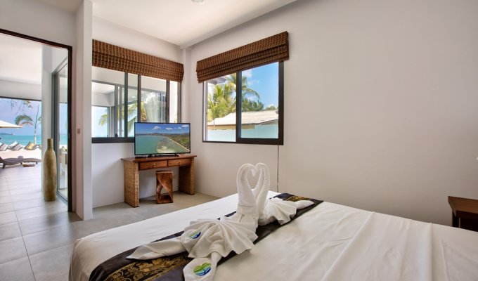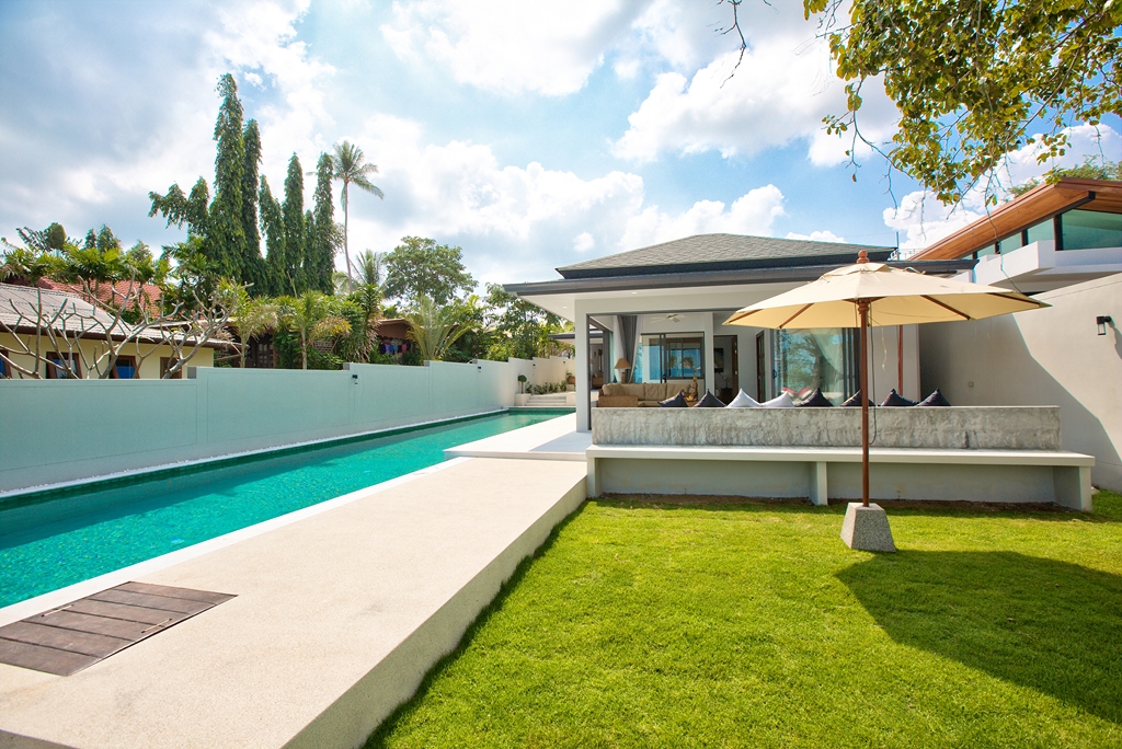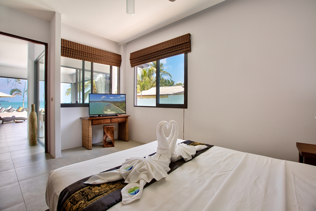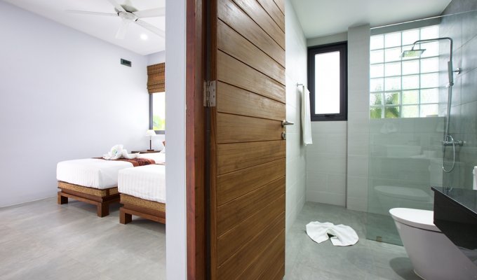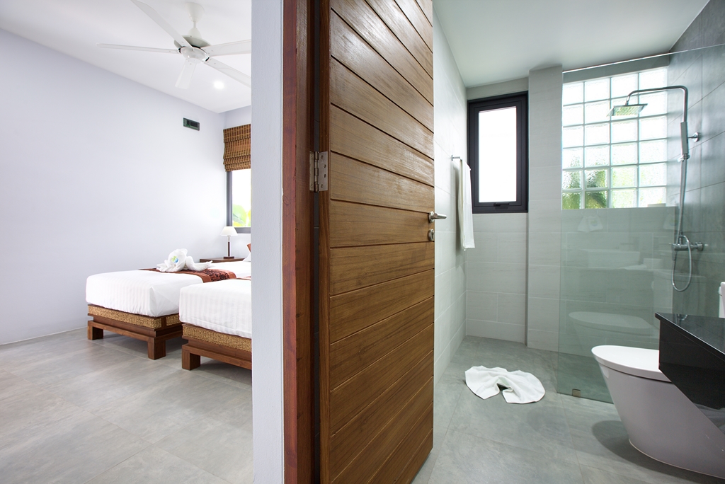 Walking through its main wooden double doors brings you to a long path overlooking the vast 20m swimming pool and beyond that, the crystal blue waters of Bangrak beach. Immediately to your left is the 4 bedroom split level villa, with 3 bedrooms on the ground floor, each with their own sleek and stylish en-suite bathrooms with rain shower heads – perfect for guests. Twin beds and 2 queens are available and easily configurable.