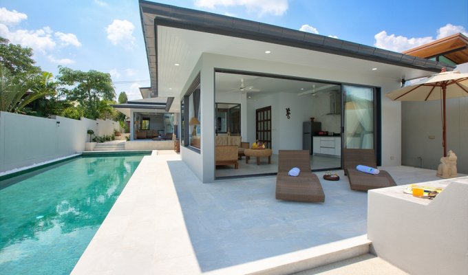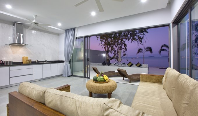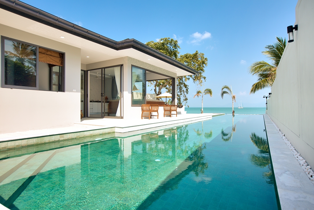 Last but not least is the 1 bedroom beachfront villa -again complete with living/dining with a modern kitchen and a bedroom with queen size bed, flat screen TV and private sleek en-suite - this villa captures the views of the beach and pool all in one. Thai art graces every wall as well as down to the finer touches of cushions, throws and sculptures giving you a modern sleeping space with a traditional edge. Whether indoors enjoying the eye catching beauty that adorns the walls or outside watching the clear Samui sky – this luxury villa is perfect for those seeking luxury and relaxation and is sure to form part of an unforgettable holiday.
