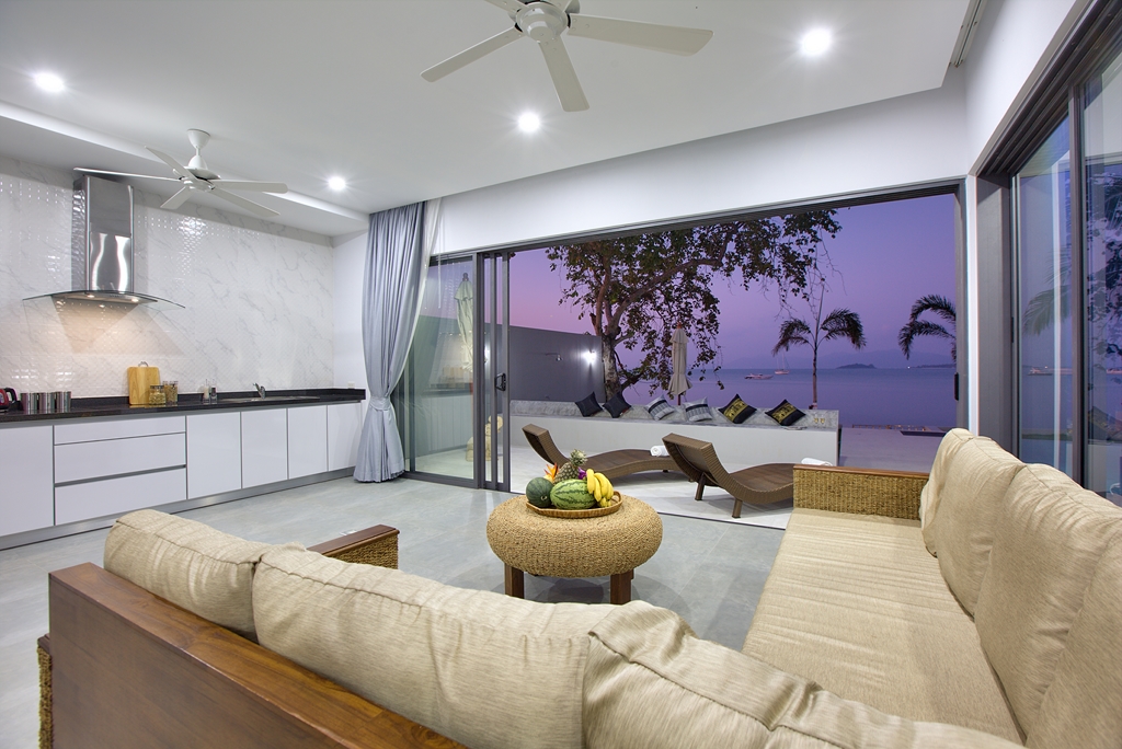 Walking up the stairs brings you to a vast open outdoor space where dining and kitchen merge in to one, with a generous outdoor living/dining area offering incredible sea views. A modern kitchen which blends seamlessly with house, sits adjacent to the dining deck with complete western fittings including microwave, oven, double fridge/freezer and all the modern necessities of home. The kitchen allows for easy entertainment for guests, friends and family alike - creating a centre for the house where food and company can be enjoyed by all. The indoor living area adjoining the kitchen offers a flat screen TV and sound bar, where you can connect and entertain yourself for hours.