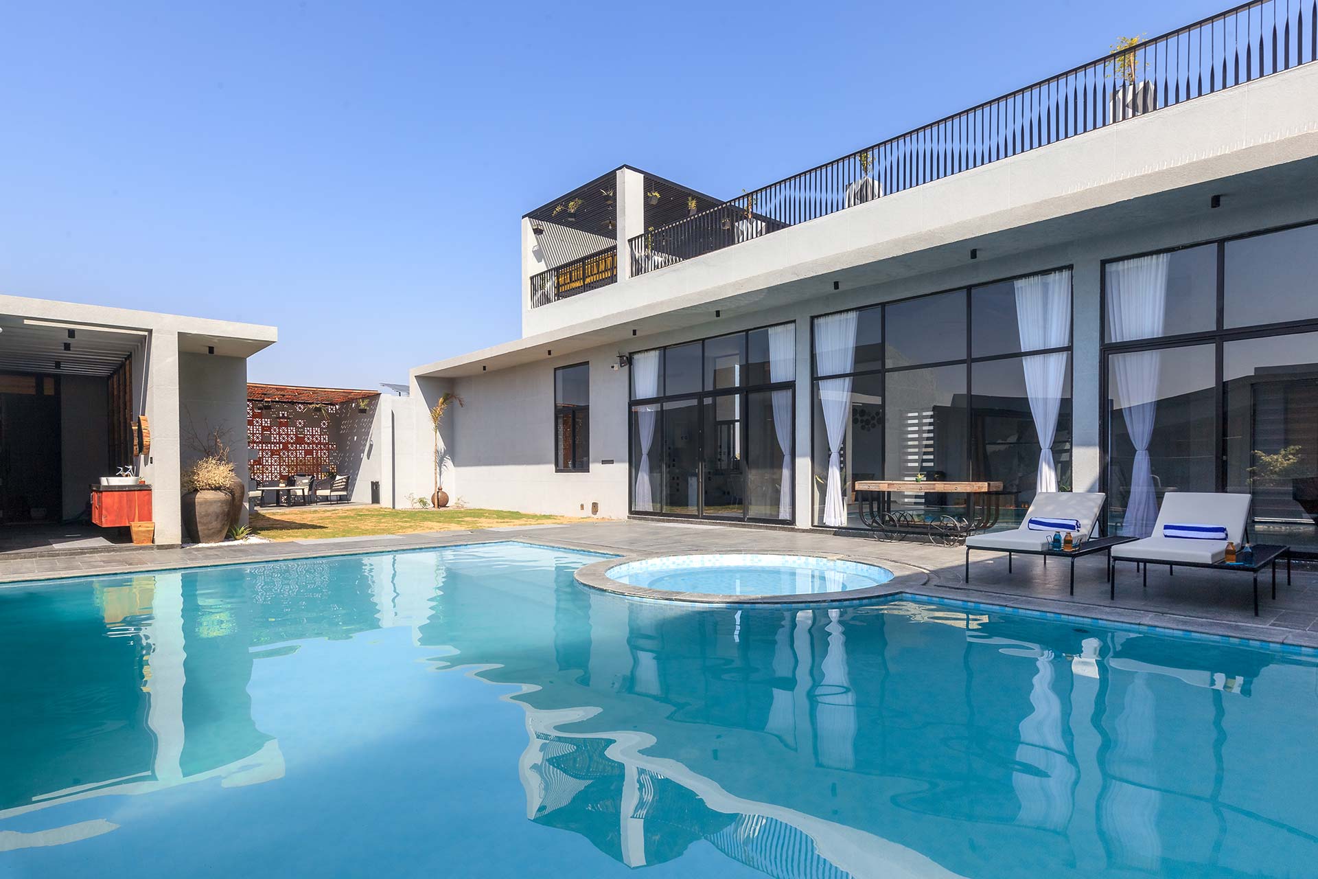 A day at this property is an invitation to indulge in an experience like no other. The magnificent symmetrical concrete facade is adorned with delicate wooden details that set the tone for the stunning interiors. The theme of concrete flows from floor to ceiling, creating a striking contrast that embodies luxury living at its finest. The private pool adapts to every season, offering cool blues in the summer months and warmth during chilly winter days. An inviting jacuzzi awaits those looking to unwind and rejuvenate. The lush lawn boasts a gazebo, swings, and a picturesque view of the pool, perfect for lounging and taking in stunning surroundings. For those in search of a unique and memorable setting, the creatively designed sunken bar is the place to be. Whether you're in the mood for enchanting conversations, merrymaking, or simply sipping a drink, this bar has everything you need. The 250-meter walkway is perfect for fitness fanatics looking to take a stroll or cycle around. The terrace provides a mesmerizing view of both sunrise and sunset, making it an ideal spot to enjoy the natural beauty of the surroundings. The garden amphitheatre is perfect for outdoor events and gatherings, while the home theatre is ready to screen your favorite films, from romantic comedies to thrillers. Two beautifully landscaped gardens, featuring a lily pond and a cozy fireplace, offer a peaceful escape from the hustle and bustle of daily life. The culinary delights crafted by talented in-house chefs are sure to impress, and an array of amenities for kids' entertainment are available to keep everyone entertained. A carefully curated collection of games and books is on hand for those looking for a quiet moment to themselves. The property is also equipped with a cricket set, badminton racket, football, volleyball and yoga mats. And with proximity to Jodhpur's renowned tourist hotspots, this property is the perfect base from which to explore the city and its many wonders. In all, a day at this property promises an experience filled with luxury, comfort, and endless possibilities for fun and adventure.
