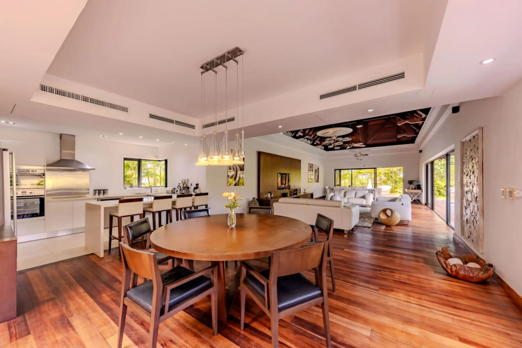 The air-conditioned bedrooms have en-suite bathrooms, some with outdoor showers for an immersive experience in the heart of nature. The spacious, elegant, and bright living area includes a refined lounge, an open-plan dining room, and a fully equipped modern kitchen.