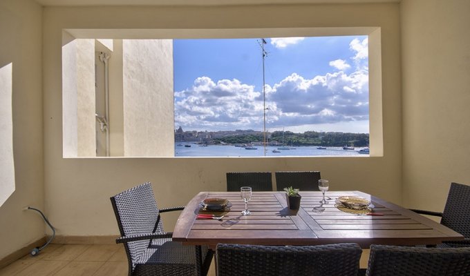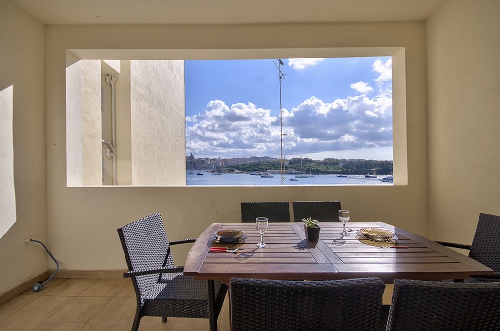 This particular apartment is on the 2nd floor served with lift. At the entrance it has a spacious living area leading to the dining/kitchen area where it leads to a glass door opening, leading to a sizeable terrace with seaviews of Sliema. The terrace comes complete with outdoor seating area for 4 people. This space is ideal to spend a relaxed day in the sun or else for a fresco candle light dinner. The kitchen is also fully equipped and is ideal for preparing own meals and easy cooking.