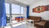 This particular apartment is on the 4th floor served with lift. At the entrance it has a spacious living area leading to the dining/kitchen area where it leads to a glass door opening, leading to a sizeable terrace with seaviews of Sliema. The terrace comes complete with a Jacuzzi and with outdoor seating area for 4 people. This space is ideal to spend a relaxed day in the sun or else for a fresco candle light dinner. The kitchen is also fully equipped and is ideal for preparing own meals and easy cooking.