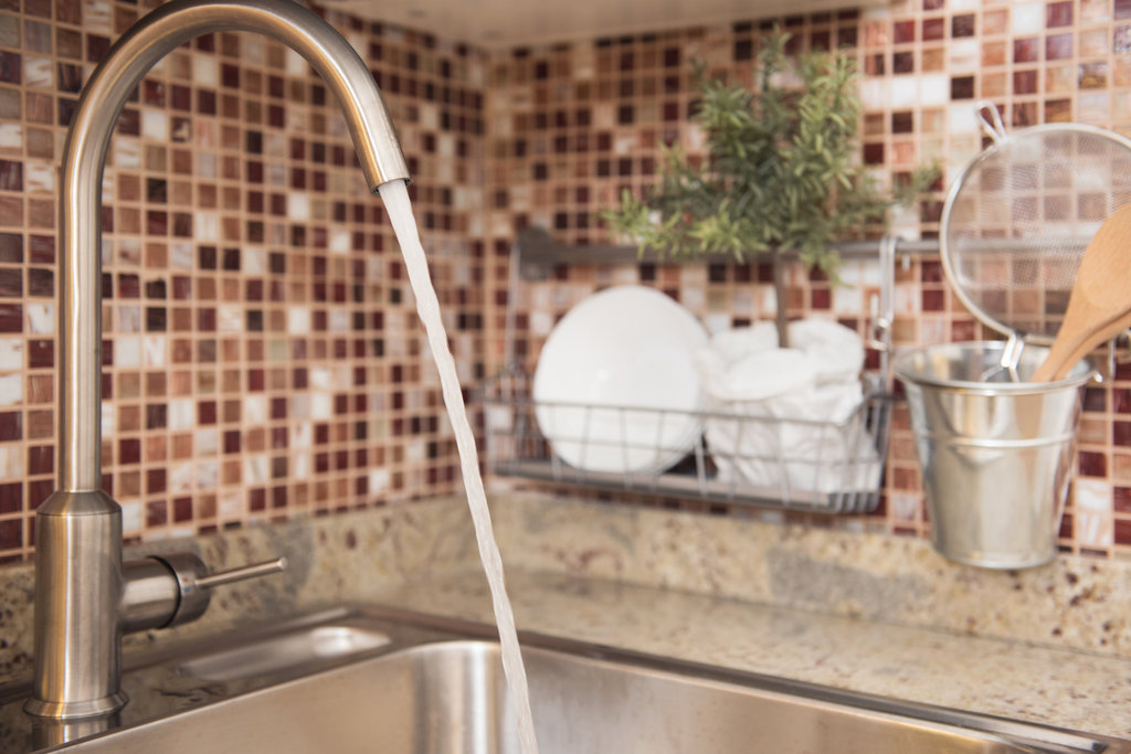 The warm colored mosaic that covers the wall unit is the perfect contrast to the soft white of the doors.
