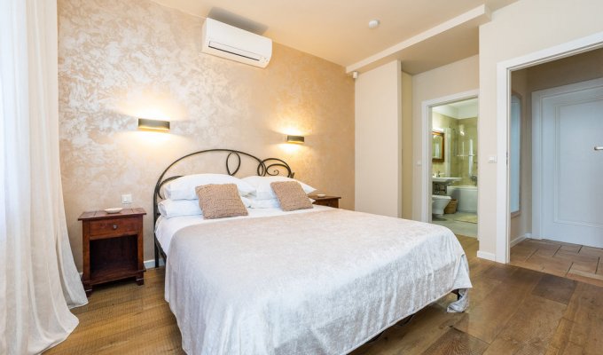 This beautiful house in secluded place far away from the city is the right choice for large families, for a relaxing holiday. Apart from the stylish and contemporary furnishings, there is a pool (heated) on the large grounds, Jacuzzi, sun loungers and a lounge area, where guests can relax and refresh themselves during hot summer days. In the evening, you can unwind in the sauna. The garden, laid out like a Mediterranean Park, also has a vegetable garden, where you can do gardening. This holiday house is located only 12 km from Sibenik. You can have a panoramic view from the first floor terrace, as it is located on the opposite bay. The popular tourist town of Vodice is only 7 km away and has rich dining options. You can also visit the National Parks Krka and Kornati.