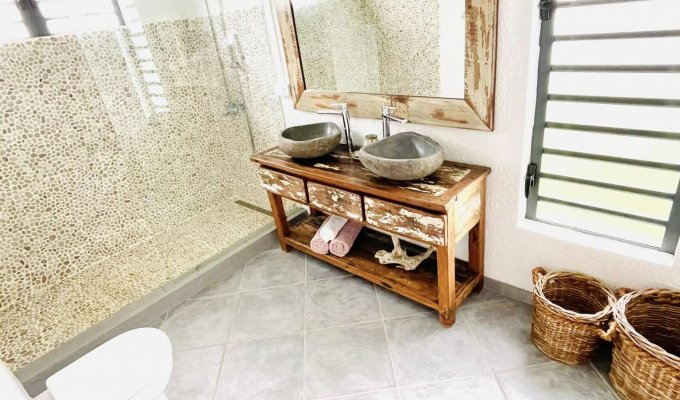 The villa is approximately 700 meters from Bain Bœuf Beach (a 10-minute walk) and a short drive from the iconic church at Cap Malheureux and its local market, where you'll find fresh fish. With approximately 149 m² of living space, the villa offers bright and inviting rooms that open onto the outdoors. Fully air-conditioned, the villa can accommodate up to 8 people thanks to: