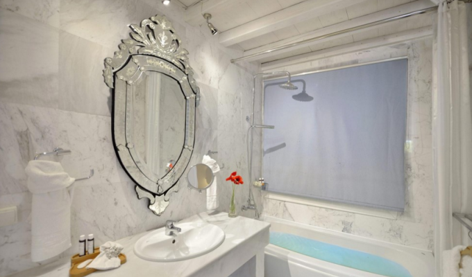 All rooms have marble bathrooms (bath, steam room, whirlpool bath), toiletries, hairdryer, mini bar, satellite TV, telephone, internet access, air conditioning, safe, balcony or terrace with sea view .