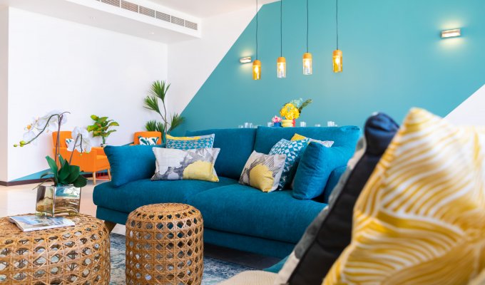 With views of the Arabian Gulf and the iconic Atlantis hotel as a backdrop to your stay, this living space features double sofa’s, stylish rattan bucket chairs, a six seater dining table and a separate seating area with twin reading chairs. Guests can access the furnished terrace from here for their morning coffee with a view. The fully fitted kitchen is closed off to the main area leaving it calm and collected, it comes complete with all the necessary appliances for a seamless stay. The apartment has a guest bathroom alongside three en suite’s with a mix of bath and shower units for your convenience.