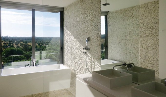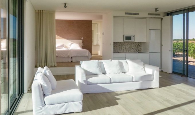 Portugal Luxury Villa Holiday Rental Lisbon Coast located near Comporta, one of the most exclusive places in Portugal, only 16 km from Pego, one of the most beautiful beaches in Europe, known for its crystal clear waters and white, fine sand. This breathtaking holiday villa has a modern open plan living room with large windows and an infinity pool that offers fantastic views of the countryside. It is the ideal retreat for a romantic couple vacation with every imaginable luxury and absolute privacy. The design of the villa combines modernity with nature and grows from the dunes of the dreamlike surroundings.